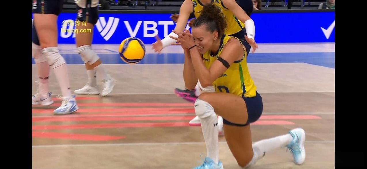 女排世联赛总决赛金牌战,意大利女排第二局25-18胜巴西女排,前两局大比分1-1
