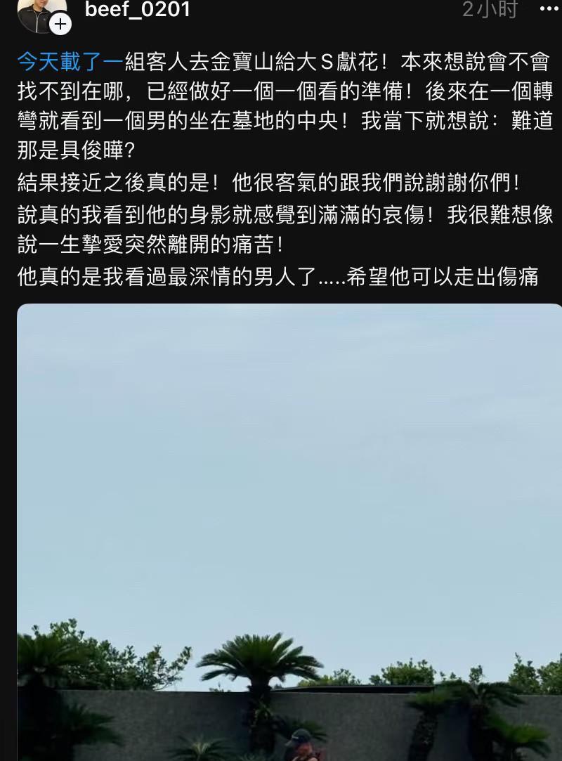 竟然真的有人拍到坐在墓地里的具俊晔! 这位晒出照片的网友是出租车司机,偶然拉到一位要去金宝山给大s献花的粉丝…… 他自己都没有想到,以前只是通过s妈的帐号知道具俊晔经常去墓地陪伴大s,没想到竟然会被自己遇见! 从照片看 具俊晔真的又黑了好多啊!这位网友讲看到具俊晔默默坐在那里心里都替他难过…… 这位网友也感慨具俊晔是他看过最深情的人,他希望具欧巴能走出伤痛…… 这距离大s离去快半年了,就连称最爱姐姐的小s都开始出来支持女儿画展,在老公的陪伴下逛街…… 具俊晔却依然走不出来,可见大s在他心目中的地位有多重要了!