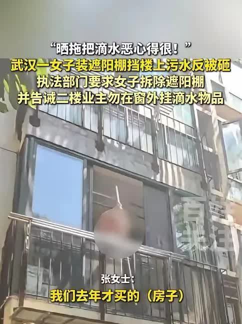 “太缺德了!”湖北武汉,女子住在一楼,为了图方便,就在后面开了扇门,不料,楼上老太太专门从门的位置晾拖把、笤帚、垃圾桶,把污水全部滴在女子门口。多次协商无果后,女子安装了遮阳棚,没想到老太太直接用棍子砸毁! 武汉有个住一楼的小姐姐,为了出门方便,就在房子后面加了个门。可没想到,楼上的阿姨不高兴了,尤其是那位老太太,老是在新门上面晾拖把、扫帚,甚至挂垃圾桶,脏水滴滴答答的,门口都快成“水帘洞”了。小姐姐跟老太太说了好几次,想让她别这么干,但都没用。没办法,小姐姐只好在门口搭了个遮阳棚挡水。结果老太太一棍子就把遮阳棚给砸了。这事儿被邻居拍下来发到网上,大家都炸了锅,说:“这也太过分了吧!”有人开玩笑说老太太“投掷”技术一流,能去参加奥运会了,也有人问,社区调解的人呢?这事儿不是第一回了,从上海到重庆,啥奇怪的反击手段都有,邻里间的“高楼大战”成了城市里的老大难问题。专家说,这些纠纷啊,都是因为公共空间界限不清,要是物业、社区早点管管,也不至于闹成这样。 最后,遮阳棚被砸了,两家人也彻底翻脸了。这事儿让人不得不琢磨,城市里的邻里规矩,到底该怎么划清界限呢?