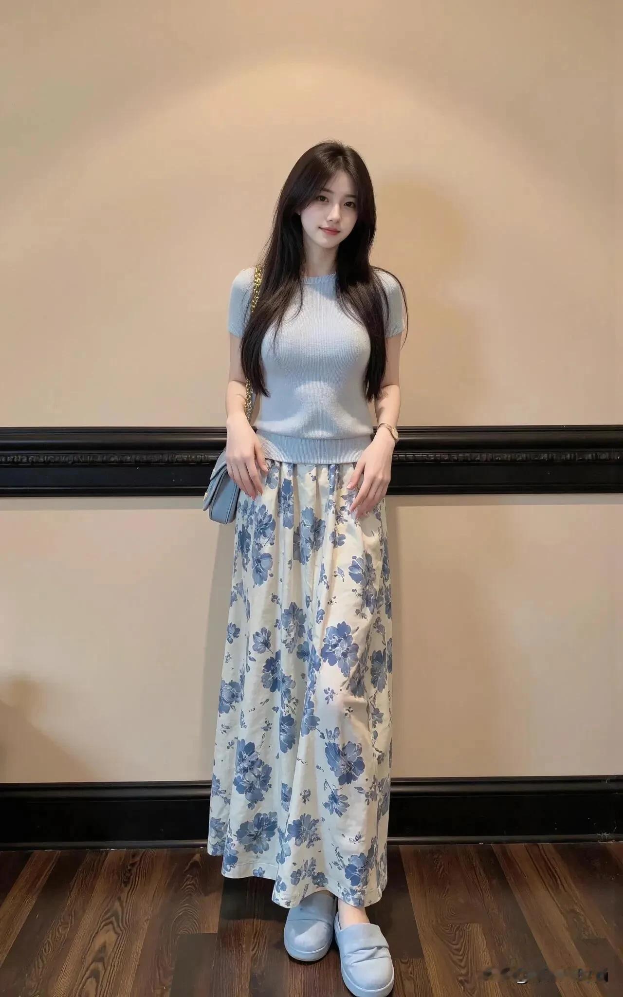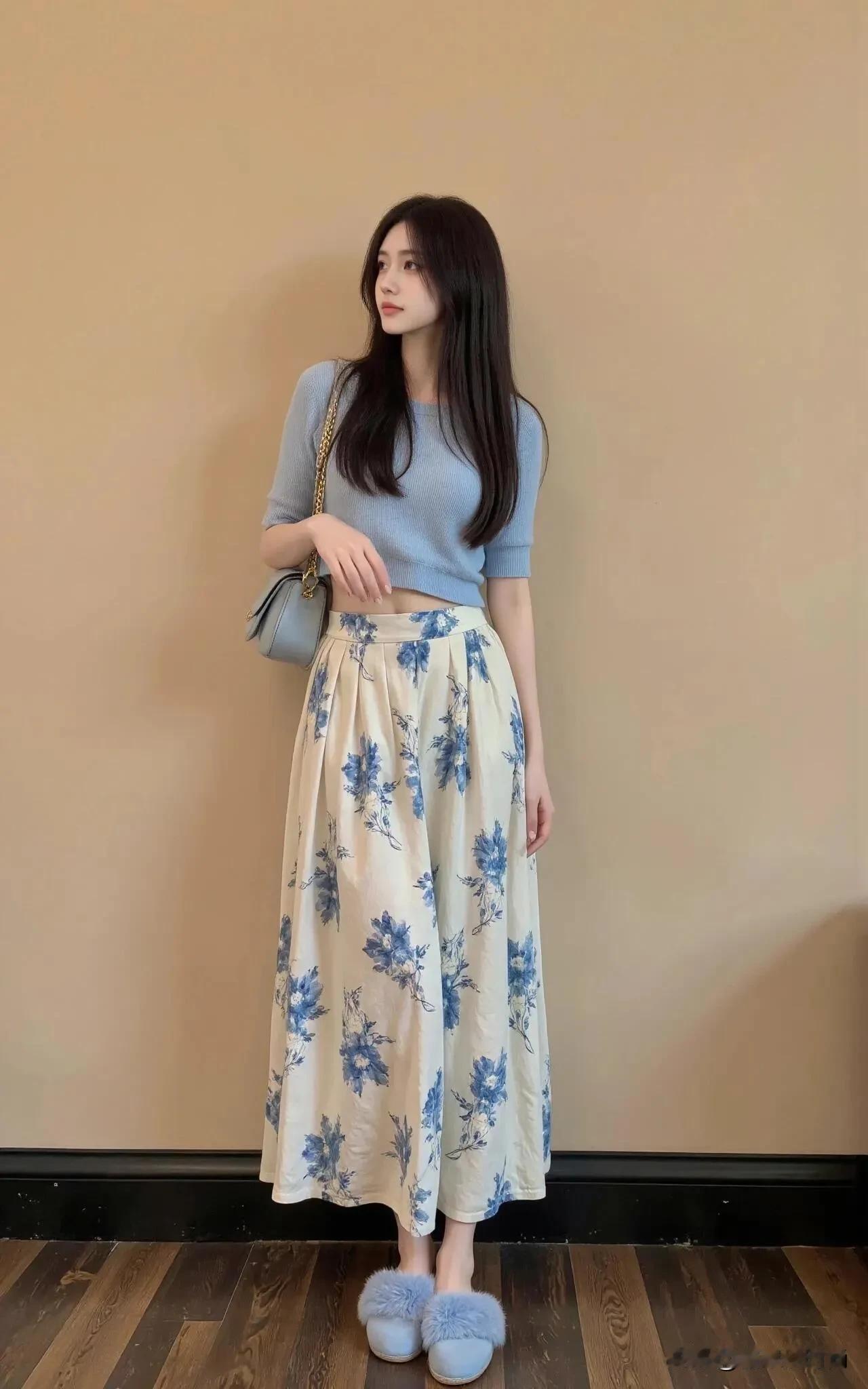 就是喜欢这种蓝色系搭配,给人一种安静中,带着温婉贤淑感觉。 上身选择收腰款式的针织衫,配上蓝色印花长裙(最好是选择长款的),搭配着同色系的鞋子。 整个人看上去,清爽清新,一眼看上去就爱了。 夏季可以选择的衣服风格真的很多,而我认为能够搭配出最佳体验的穿搭,一定是经过精挑细选的。 蓝色系的穿搭就算其中一种,不知道有多少人和我一样,喜欢这种穿搭呢?