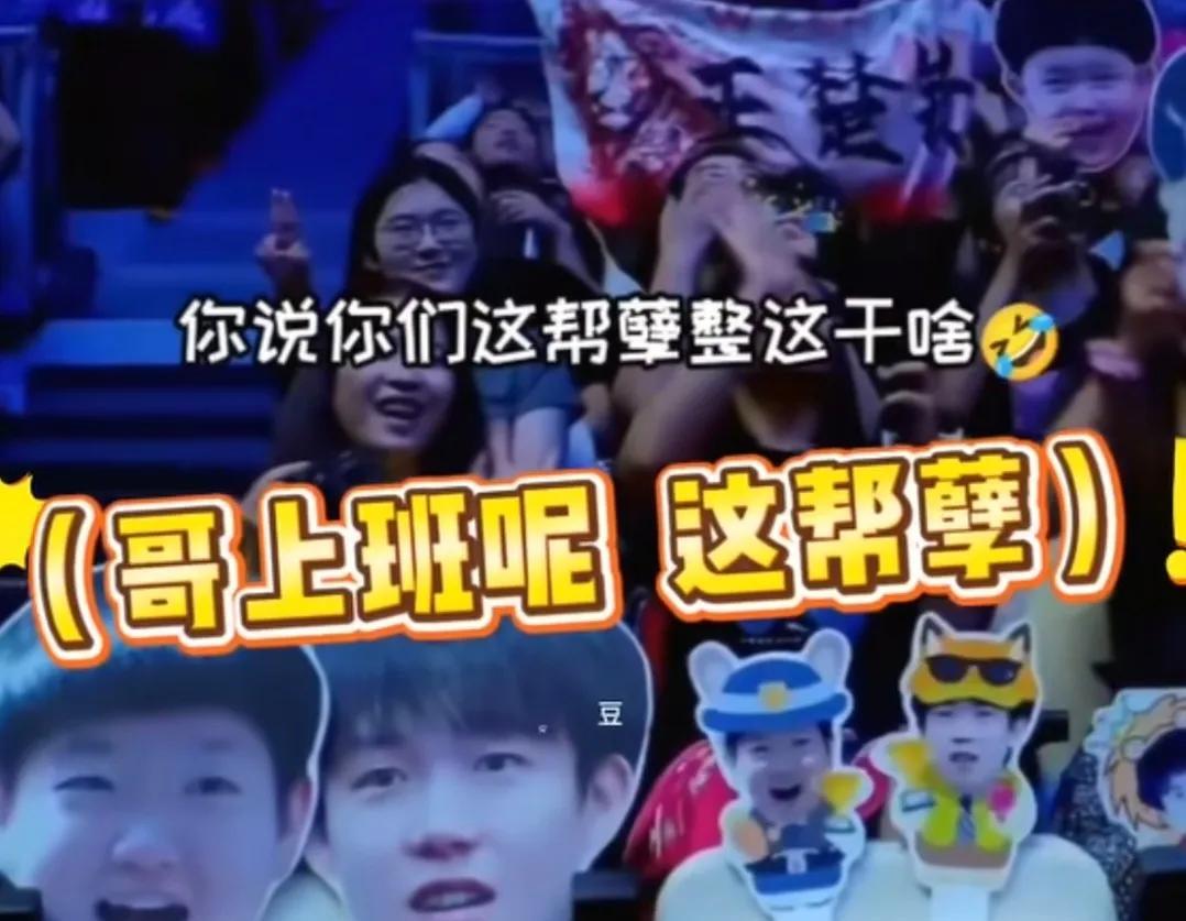 王楚钦你这是暗爽啥,还在上班呢! 昨天魏桥VS黄石,莎头粉又搞事了!坐前排的球迷把王楚钦、孙颖莎的大头贴在椅子上排了一排,这是来摆地摊吗? 更好笑的是大头贴还上了大屏,王楚钦上场时就看见了,心里爽得嘴角都压不住,最后直接拿毛巾捂脸。 祖师爷也没忍住笑了,心里肯定在说:“般配”!