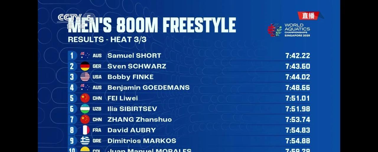 张展硕、费立伟800米自由泳,双双无缘半决赛。 张林800米自由泳的世界记录,至