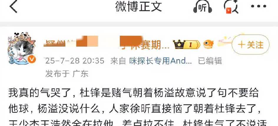 杜峰和徐昕吵架原因! 杜峰的铁粉称:杜峰赌气说让杨溢不给徐昕球,徐昕火就来了,
