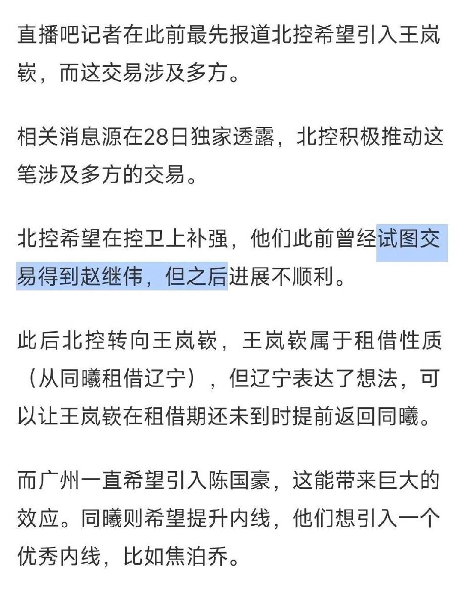这笔交易辽宁男篮亏不亏? CBA最近一直热议的一笔大交易,涉及四队三人,同曦队,辽宁队王岚嵚,北控陈国豪,广州队焦泊乔! 这笔交易北控要王岚嵚,广州要陈国豪,同曦要焦泊乔,而辽宁男篮要钱! 从引进球员看,辽宁男篮似乎两手空空,但是辽宁男篮有自己的球员,像李虎翼、张峻豪都可以弥补王岚嵚的缺失,这样也可以很好的锻炼自己的年轻球员,还能拿到一笔违约金,这也算是的好事,毕竟王岚嵚在辽宁男篮没有太大的发挥,说白了,对辽宁男篮帮助不大!