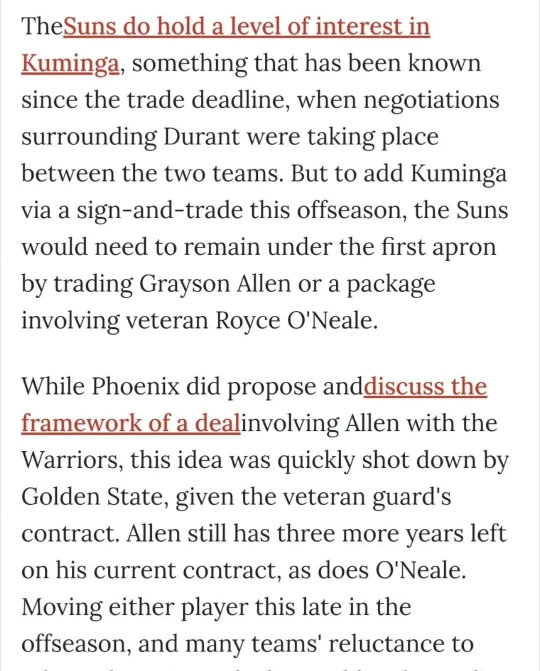 Brett Siegel: 早在交易截止日前,太阳对库明加就有一定的兴趣。如今若想通过先签后换的方式得到他,需要送出格雷森-阿伦或罗伊斯-奥尼尔。 太阳提出了阿伦签换库明加方案,但被勇士否决了。后者不愿接手长期合同,这会让他们的后续操作变得极其困难。 阿伦的合同还剩下3年5438万,奥尼尔为3年3213万。