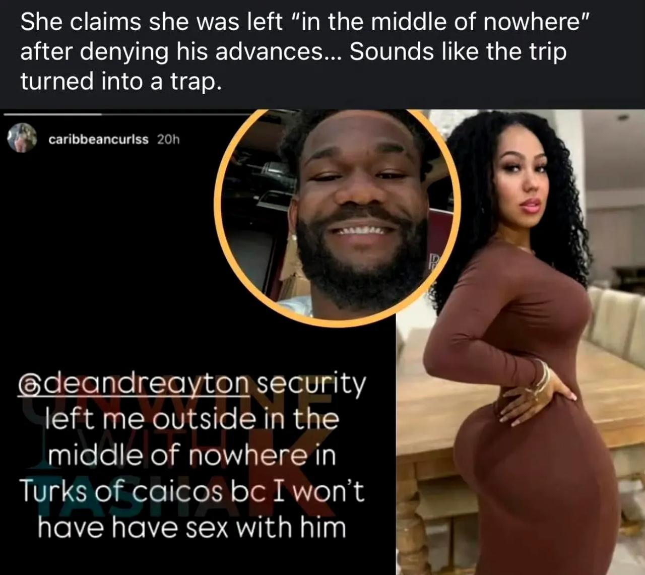 网传艾顿被指控在一名女子拒绝与其发生关系后,将其遗弃在特克斯群岛。 最初,该女子