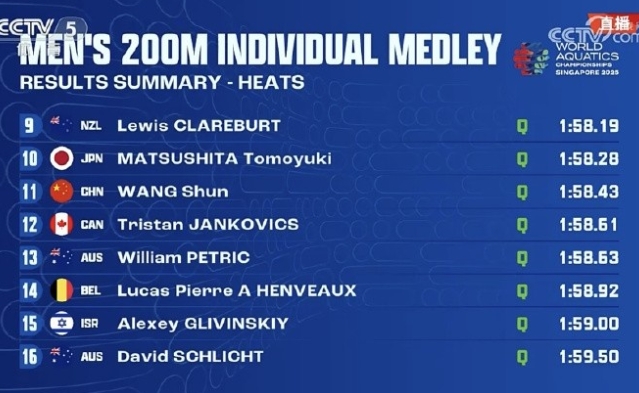 游泳世锦赛结束男子200米混合泳预赛争夺,中国选手汪顺顺利晋级半决赛。 汪顺在预赛中游出了1分58秒43的成绩,排名所有参赛选手第11名,晋级半决赛。