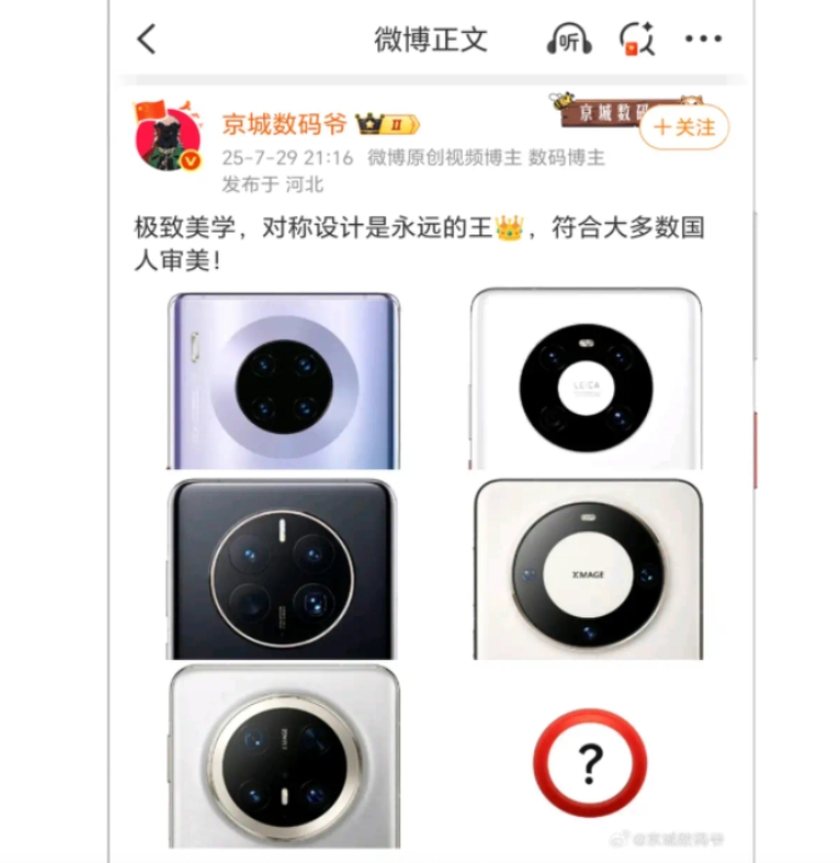 极致的对称美学,奠定了华为Mate系列的成功。 说一句机圈最成功的设计不为过! 新一代的Mate80肯定也是圆环设计,但是在圆的基础上还能玩出什么新花样呢?