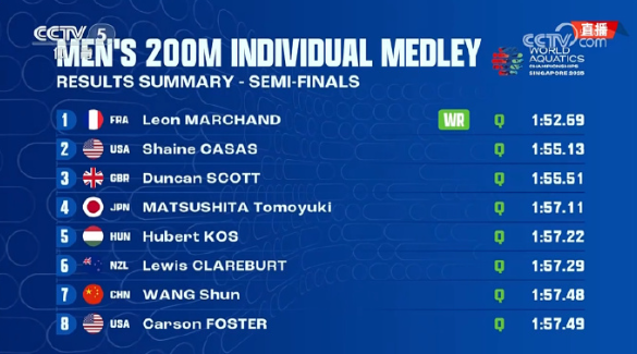 200米混合泳半决赛!1分52秒69!马尔尚打破美国名将瑞安-罗切特保持14年的200米混合泳1分54秒整的世界纪录,独享200米、400米男子个人混合泳两项世界纪录,中国选手汪顺总成绩第7晋级决赛!