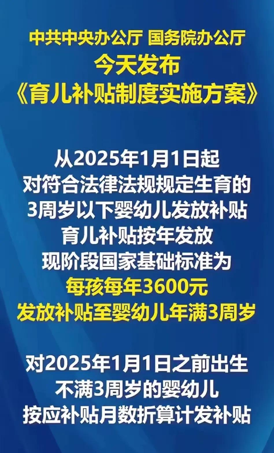 这是国家最新的育儿补贴政策,我开始还以为2022年1月1日后出生的孩子都能够领到一年3600元的补贴,直到看到这个表格,原来2022年1月1日出生的孩子只能领300元,2月出生的领600元,只有2024年12月后出生的孩子才能领到10800元。你们都了解了吗?#幼儿育儿补贴# #育儿补贴制度# #二胎育儿补贴# #育娃补贴# #育儿补助# #婴幼儿补贴#