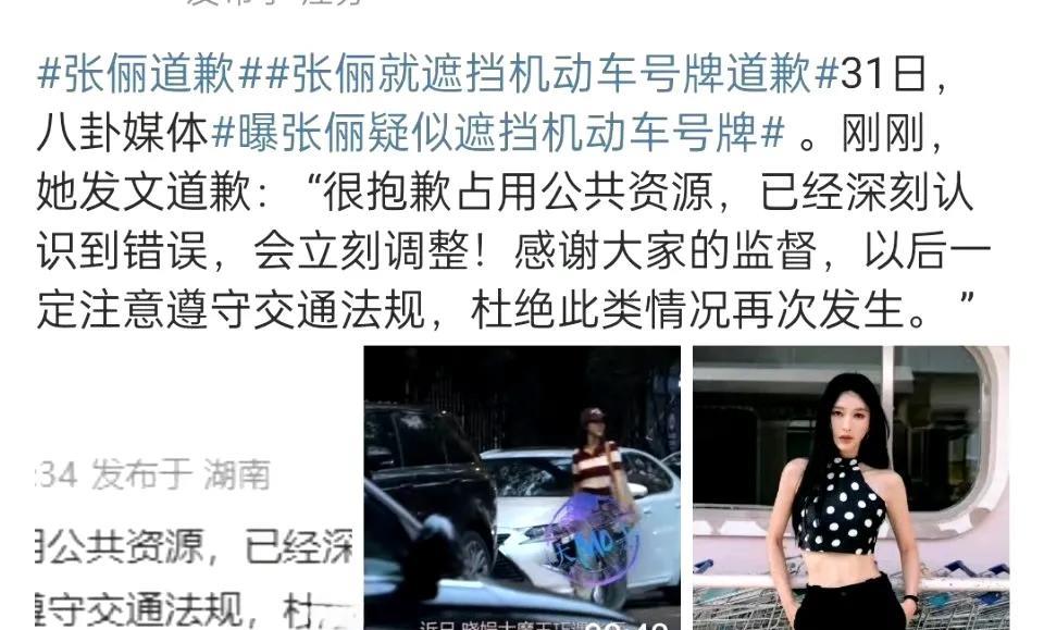张俪道歉# #张俪就遮挡机动车号牌道歉# 31日,八卦媒体曝张俪疑似遮挡机动车号牌。随后,张俪发文道歉,称“很抱歉占用公共资源,已经深刻认识到错误,会立刻调整!感谢大家的监督,以后一定注意遵守交通法规,杜绝此类情况再次发生。”