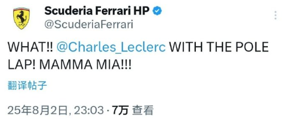 法拉利车队车手勒克莱尔夺得2025赛季F1匈牙利🇭🇺大奖赛,排位赛的杆位