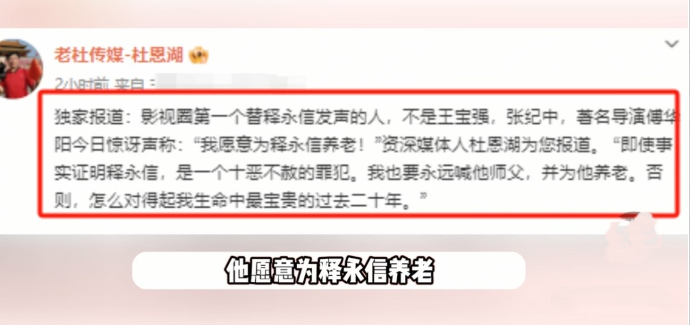 释永信61岁徒弟傅华阳发声,称“愿意为他养老”。 傅华阳强调与释永信“情同父子”,称二十年间释永信在生活、事业上给予其支持,甚至在最困难时提供帮助。 这种长期积累的情感纽带,便其选择在舆论风波中公开维护师父,以“知恩报恩”“力挺”自己的“恩师”。此乃难能可贵。