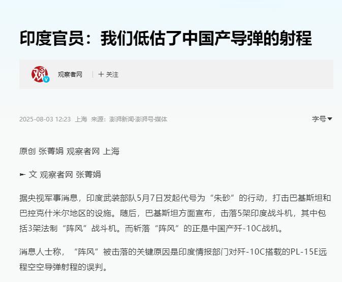 印度官员:“阵风”被击落,是因为飞行员以为自己在PL-15E射程之外。 巴基斯坦用咱们中国产的歼-10C和PL-15E导弹,把印度当宝贝的“阵风”给打下来了,关键原因竟然是印度人自己搞错了PL-15E的射程。 真要追究起来,印度的情报部门怕是得背个大锅,他们觉得这导弹最多打150公里,结果人家从200公里外就发射了,飞行员还傻乎乎以为自己在安全区,这不就成了活靶子吗? 你连对手的武器到底能打多远都搞不清,那跟闭着眼睛打架有啥区别?印度飞行员估计到最后都没明白,怎么自己还没看到敌机,导弹就过来了,这也能看出,现代空战早就不是拼谁的飞机飞得花哨了,信息和武器性能才是硬道理。 印度那边嘴硬,说自己没损失“阵风”,但巴基斯坦都拿出残骸照片和录音了,连法国空军参谋长和达索公司高管都松了口,说印度确实丢了“阵风”,国际上都认了这个结果,印度再否认,只能显得自己不实在。 好在让我觉得解气的是,这事儿狠狠打了那些看不起中国武器的人的脸,以前总有人说,中国武器跟中国小商品似的,质量不咋地,不如西方的好。 现在呢?歼-10C和PL-15E在实战里把法国“阵风”都干下来了,这性能还不够说明问题吗? 中国武器这些年进步可不止于此,从以前卖卖坦克、步枪,到现在能拿出歼-10C这种先进战机和PL-15E这种“撒手锏”导弹,技术水平早就上来了。 还是那句话,实战是最好的试金石,这次印巴空战就是证明,中国武器不光不差,某些方面可能比西方的还厉害。 这场空战不光是印巴之间的一次交锋,更让全世界看到了中国武器的实力,那些抱着老偏见不放的人,也该醒醒了,别总觉得西方的月亮圆,中国武器用实打实的表现,证明了自己能行。 #头号创作者激励计划#