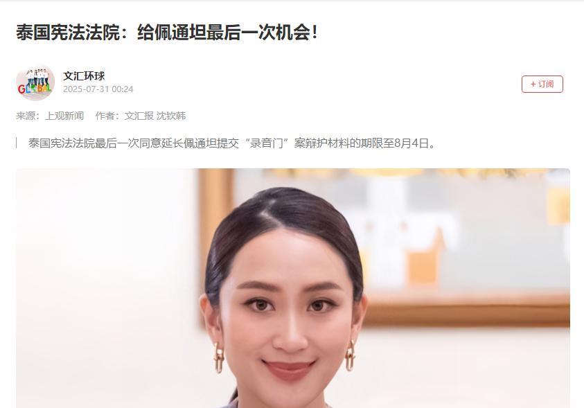佩通坦到底能不能翻身,今天是关键时刻。 今天(8月4日)是佩通坦提交“通话门”辩护材料的最后期限,这一天基本能定下她能不能继续坐在总理位置上,两个月来她被这事折腾得够呛,从6月录音曝光到7月被暂停职务,现在终于到了摊牌的时候。 材料能过关就回来,过不了可能就得步父亲他信、姑姑英拉的后尘,卷铺盖走人,我感觉没啥问题,她手里的牌可能比外界想的要硬。 一开始佩通坦就没坐以待毙,三次申请延期交材料,硬生生把时间从15天拖到今天,这明摆着是在为自己争取喘息空间,更聪明的是,她趁着内阁改组赶紧兼任了文化部长,这步棋太关键了。 别看只是个文化部长,既能让她在停职期间继续留在权力圈,又能借着文化事务刷存在感,她上任就暂停归还柬埔寨文物,嘴上说“预算紧张”,实际上是在讨好国内民族主义者,顺带向军方示好,这手腕确实够灵活。 而真正让局势逆转的是6月底爆发的泰柬边境冲突,本来这是个麻烦事,却被佩通坦玩成了加分项,她以文化部长身份跳出来放狠话,说“谈判时间已过,军队已做好准备”,还跑到边境摆拍,照片里又是戴王室勋章又是举泰王画像,这明显是在拉王室和军方站台。 这招太高了,一下子就把自己从“通话门”里的软弱形象扭成了“护国者”,军方看她这么上道,关系自然缓和了不少。 更重要的是她“王室侄媳妇”这层身份,这简直是护身符,她丈夫是王室旁系,论辈分得叫泰王“伯父”,有这层关系在,王室不可能眼睁睁看着她倒台。 泰王先是批准她当文化部长,后来又默许她高调展示王室支持,这态度已经很明显了,王室需要她来平衡军方势力,维持现有的权力格局。 所以综合来看,佩通坦翻盘的概率真不小。 宪法法院之前5:4同意延期,说明内部有分歧,未必会下死手;她的支持率也从低谷回升,底层民众念着他信家族的好,基本盘还在;加上洪森那边泄露录音确实不占理,她完全可以倒打一耙说对方干涉内政。 当然风险也不是没有,军方鹰派肯定还在盯着她,保守派政党也没闲着。但照目前的架势,只要今天的材料不出大纰漏,她回来当总理大概率是板上钉钉。 毕竟在泰国政坛,从来不是光讲法理,关系、时机、手腕都得占全了,而佩通坦这几样现在都齐了。 #头号创作者激励计划#