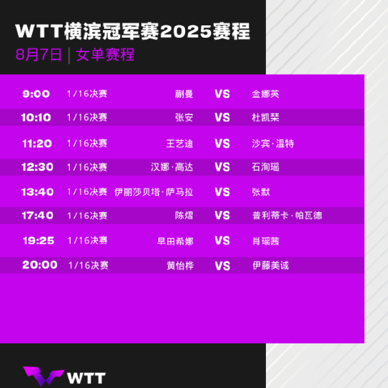 【8月7日】 09:00 蒯曼vs金娜英 10:45 薛飞vs安东·卡尔伯格 11:20 王艺迪vs沙宾·温特 11:55 陈垣宇vs王楚钦 12:30 石洵瑶vs汉娜·高达 17:40 陈熠vs普利蒂卡·帕瓦德 18:15 林诗栋vs林昀儒