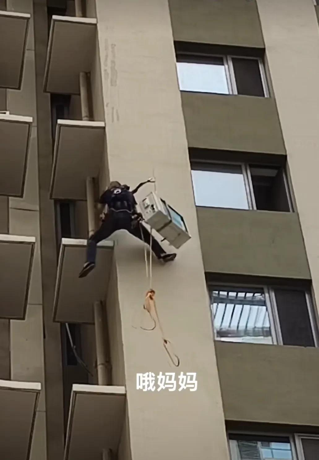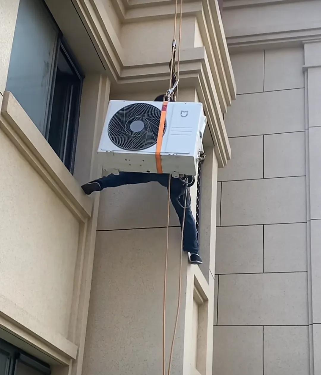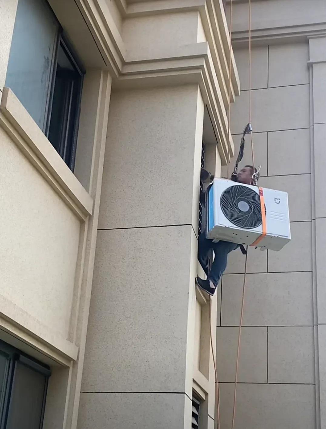 现在买空调有补助,一台新的空调才一千多块钱,空调虽说便宜,但是安装费不便宜。 城市里大部分都是高楼大厦,有的几十层,安装空调真是一个头疼的事,又没有梯子,又没有外防护。 像这种人只有胆子大的人可以,胆小的看着就害怕,别说还要背着空调室外机,简直比爬楼还要难。 你看这个安装空调的,身体背着室外机,借着一根绳子的力量,在外墙上挂着安装空调,实属不易。 各位工程师看看,这样安装一台空调需要多少钱的安装费?