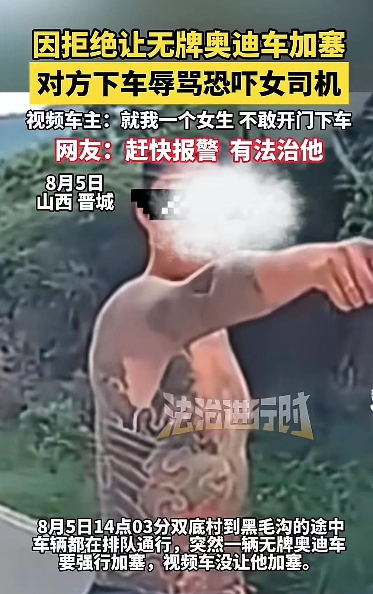 “奔驰亮证姐刚被拘留,又一个不长记性的来了!”山西,女司机因拒绝让无牌奥迪车加塞,车上一个光膀纹身男子下车辱骂恐吓女司机!女司机:我车上就我一个人,不敢开门下车!网友:赶快报案,有法治他! 8月5日14点3分,双底村到黑毛沟的途中发生堵车,车辆都在排队通行,突然一辆无牌奥迪车要强行加塞,但女司机没让他加塞。 可没想到,这辆奥迪车竟再次加速,径直开到更前方,强行插入队伍后,还找了个地方停车,然后“守株待兔”,等着女司机到来。 当女司机的车缓缓靠近时,车上下来三个男人,他们气势汹汹,如恶狼般逼迫女司机停车,还恶狠狠地威胁要动手打她。 女司机瞬间被恐惧笼罩,身体不受控制地瑟瑟发抖,不敢开门下车。 其中,一个光着膀子、满身纹身的男子更是嚣张至极,他用手指着女司机,破口大骂,还将嚼过的槟榔狠狠砸向女司机的车窗。 三个大男人欺负自己一个手无缚鸡之力的女人,这种行径简直令人发指。女司机越想越气愤,将这件事情发到网上,让大家看看这几个男人那嚣张跋扈、目无法纪的丑恶嘴脸。 此事引发了热议,有网友说,上一个这么嚣张的是昆山龙哥,也不知道轮回到哪一层了!别看他们纹身,其实就是一个小混混,真正的大哥,不会这么明目张胆的嚣张! 也有网友说,真是不知天高地厚,纹龙扎虎,耍横的年代早已经过去了,扫黑除恶的漏网之鱼……抓紧报案, 坐等他怎么老虎变猫! 还有网友说,假如这个女生胆小,经这么一吓唬,错把油门当刹车了!那又是另一个故事了吧! 在交通规则面前,人人平等,没有谁可以凭借蛮横和暴力肆意践踏。这起事件中的三个男人,他们的行为不仅是对交通秩序的破坏,更是对社会公序良俗的公然挑衅。 文明驾驶,本应是每一位司机的基本素养,可他们却将其抛诸脑后,用野蛮和暴力来解决问题。若这种行为得不到应有的惩处,那么交通秩序将陷入混乱,每一位在路上行驶的司机都将面临无端的威胁。 希望当地警方立即行动起来,找到这3名男子给予惩罚!我们必须坚决抵制这种恶劣行径,让规则成为不可逾越的红线,让文明驾驶成为道路上的主旋律!(来源:法治进行时)#头号创作者激励计划#