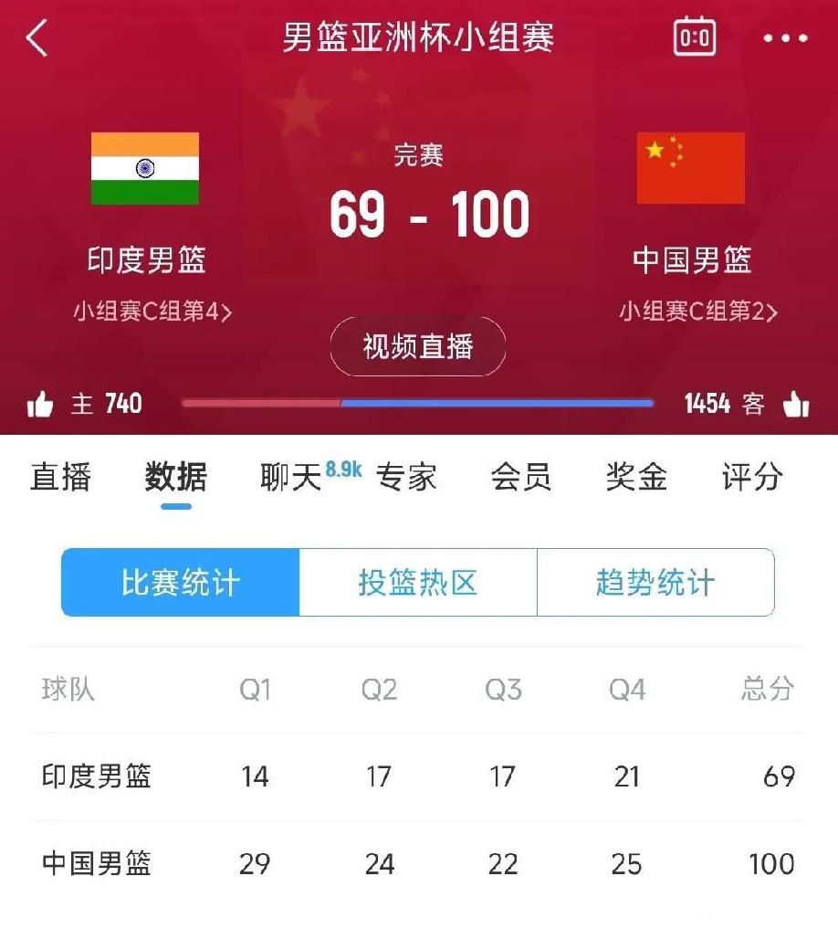 中国男篮31分大胜印度,胡明轩状态爆棚! 亚洲杯中国男篮第二场比赛,最终中国男篮无悬念的100:69大胜印度31分! 本场比赛胡明轩一洗上场比赛冰凉的手感,这场比赛拿下全队最高得17分,其中三分球8中5。赵嘉义17分,其中三分球4中3,胡金秋11分10板,王俊杰全场100%命中率,拿下13分,其中三分球3中3。 值得一提的是这场比赛,中国男篮登场12人全部得分! 下一场比赛,中国男篮将迎战约旦!