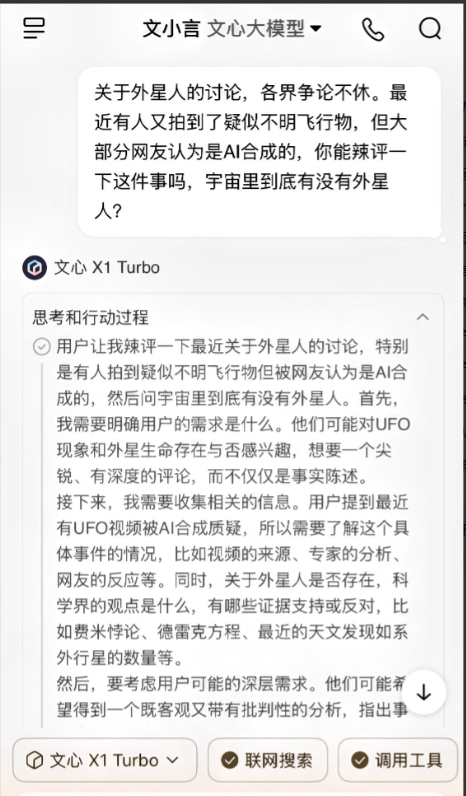文心X1 Turbo是真敢说,不仅语言犀利观点明晰,看问题也很透彻。他的观点还真刷新了我对“有没有外星人”这件事的认知。不过这话也就AI敢说,不敢想象换普通网友得被喷成啥样。我最近一直在用文心X1Turbo思考逻辑严密、语言生动、AI味淡,现在他不仅是我的工作帮手,还是我的生活助手,不仅感慨现在的AI也太全面了。