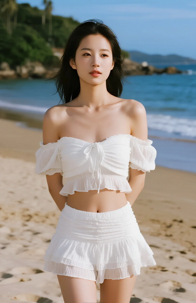 海风轻拂,她在金色沙滩上留下夏日的脚印