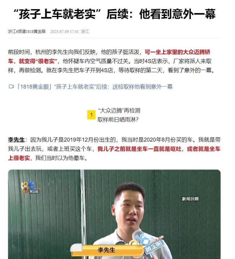 2020年8月,杭州的李大哥为了给刚满一岁的宝贝儿子当专职司机,再加上上班路途遥远,就买了一辆大众迈腾。这不,三年时间一晃而过,李大哥发现儿子一坐这车就变得特安静,不是那种乖乖的安静,而是晕车、吐得稀里哗啦,耳朵还嗡嗡响的那种。等儿子三岁能说清楚话了,直接来了一句:“爸,车里有味儿!”李大哥这才琢磨着,是不是车里的空气不太对劲。