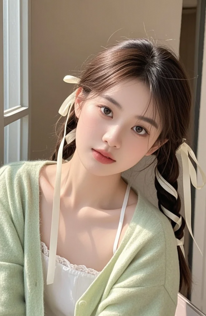 麻花辫+丝带尾梢,她靠在窗边的样子,像极了青春电影的开场