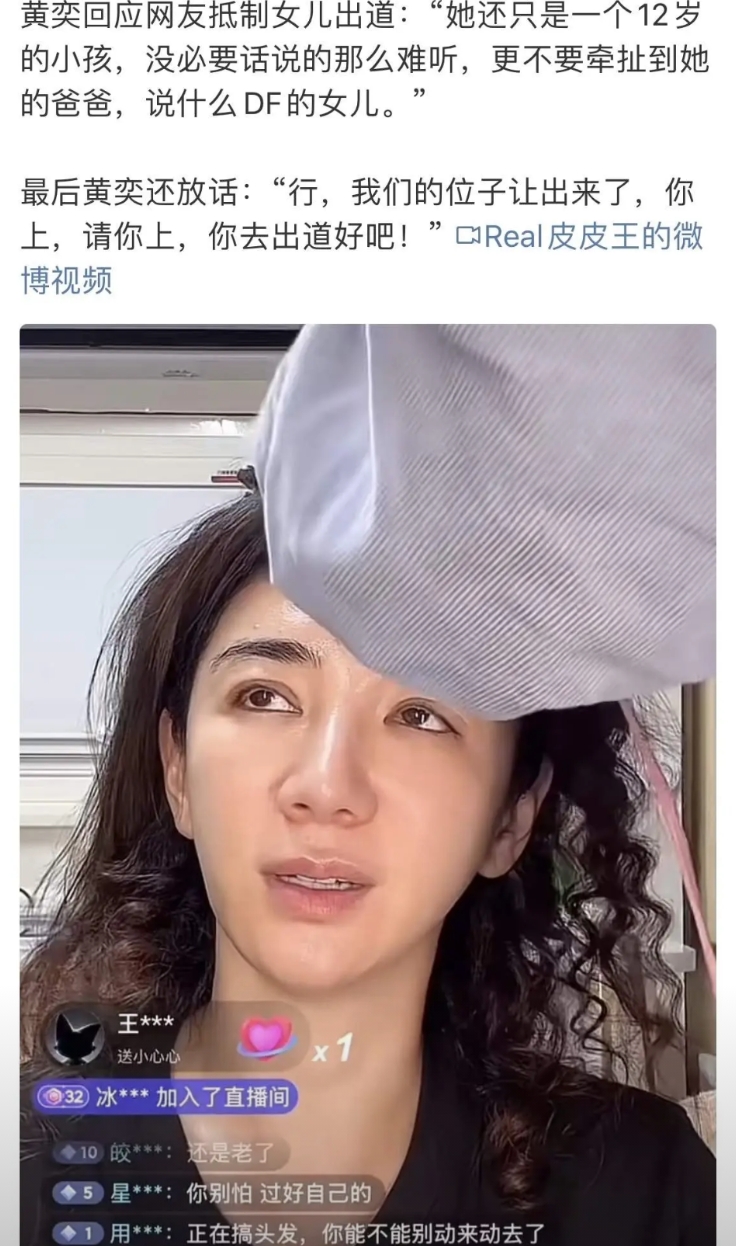 黄奕非常愤怒的回应:12岁还是个孩子,没必要说什么难听的话!行,我们位置让出来你上,请你上!你去出道好吧!