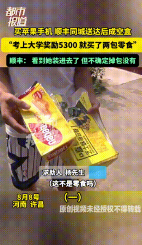 这件事在网上传开后,引发了不少网友的讨论。 有网友说,5300元其实已经可以买一部新的苹果16pro128G了,小杨肯定是被卖家骗了,毕竟卖家一开始就诱导私下交易,这本身就很可疑。 不管是卖家的问题还是快递的问题,小杨选择私下交易就已经埋下了隐患,要是通过平台交易,有平台监管,或许就不会出现这种情况了。 对此,大家又是如何看待的呢? (信息来源:都市报道——2025-08-10《买苹果手机,顺丰同城送达后成空盒。“考上大学奖励5300,就买了两包零食”。》)