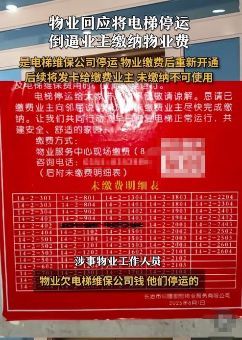 “这下后悔了吧!”近日,山西一小区物业,因为70%以上的业主不交物业费,导致入不敷出,只能停运电梯。业主却认为这是在变相逼他们交物业费,从而闹到了物业,网友:这就是一个愿打一个愿挨。 据媒体2025年8月4日报道,山西某小区的住户们近期的生活可谓是水深火热。如今在楼房遍布的城市,买电梯房自然是众多人的首选。 毕竟,谁都不希望自己忙碌了一天的工作,下班还得爬楼梯才能到家。并且电梯的存在,还为高层住户搬运大件物品提供了便利。 然而这个小区的物业,却在这炎热的夏天直接停运了两部电梯,只留下一部正常运转的电梯。而物业这么做,只因有65户业主长期拖欠物业费。 据物业工作人员表示,这栋楼一共有91户人家,但交物业费的只有26户,拖欠物业费的业主已经达到了70%,这直接导致物业入不敷出,也没有多余的资金支付电梯维保费用。 并且,物业在资金困难时就曾跟业主协商过,但不论是在群里发通知,或是在门口张贴缴费单都无济于事,甚至连物业亲自上门催缴,也没能让欠费的业主补缴物业费。 无奈之下,他们只好停运两部电梯。 更重要的是,根据工作人员透露,如果这些住户迟迟不缴费用,那么仅剩的一部电梯也会被停用。 当这一消息传出时,本就对停运电梯不满的住户更加不满了。 毕竟对于交了物业费的26户人家来说,并不是他们的原因导致物业入不敷出,没钱支付电梯维保费。 再加上这段日子,停运了两部电梯就已经让不少住户因为电梯而烦恼。更不用说把仅剩的一部也停运。 试想一下,一旦高层楼的住户没有电梯,那么老人出一趟门,就要气喘吁吁的爬楼;孩子们上下学,还要背着沉重的书包爬楼梯;上班族下班,也要拖着疲惫的身体爬楼。 可见,电梯的停运,对于高层楼住户来说,影响是非常深远的。 不过,对于这种事情,大家总会习惯性的认为,业主不缴物业费,一定是因为对物业服务的不满意,可能是因为楼道卫生打扫的不干净,可也能是因为需要维护的地方没做到位等等。 不得不说,这些原因很有可能就存在于这个小区。而物业在看到业主不愿缴纳物业费时,也不能一昧的推脱责任,而是要将各方各面的原因都考虑到。 毕竟,如今大多数人都是有素质的,并不是刻意为难谁或者故意拖欠物业费不缴。 并且,如果物业因为业主不缴物业费就停运电梯,只会加剧双方之间的矛盾。业主会更加认为物业不负责,从而更加不会按时缴纳物业费。 久而久之,双方之间只会因为矛盾的不断加深而陷入恶性循环,甚至是死循环,具体需要解决的问题也得不到解决。 所以,如今对于物业来说,首当其冲的就是提高业主的认同度,让业主愿意及时将拖欠的物业费补齐。而业主们也应为了自己生活的便利,跟物业协商出一个双方都满意的方案。 当这件事情被传到网上后,瞬间引起了网友们的热议,有网友表示感同身受,如今越来越多的物业根本不做实事。 还有网友站在中立的角度认为双方都有问题:这就是一个愿打一个愿挨。 更有网友以身做法,建议物业可以采取自己小区的这种办法:我们小区的电梯需要业主持卡扫码,住在第几层就只能乘到第几层。 如果有来客,要电话通知业主,由主人在楼上按电梯的升降键才能上去。这样一方面对业主来说比较安全,陌生人上不去,另一方面业主如果欠费,物业可以停掉他的卡。 当这件事情在网上被激烈讨论的同时,这小区的物业给出了解决方案。他们将给已经缴费的业主发放电梯卡,而没有交物业费的业主则无权享受电梯。 让所有人都意想不到的是,当物业这一解决方案发出时,不少没交费的业主纷纷感到愤怒,因为他们认为物业这样的行为跟逼着他们缴物业费没区别。 一时之间,事情似乎又陷入了死循环。物业有物业的苦衷,业主又业主的想法,双方之间谁都不肯后退一步。 参考资料: