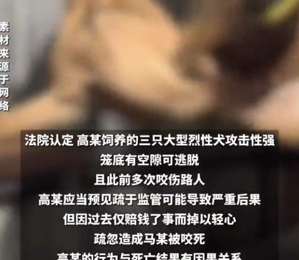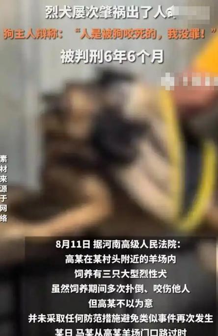“决不能轻饶!”河南一烈犬,屡次咬人主人却不管不顾。撕咬路人致其当场死亡,获刑6年半后,又辩称:人是被狗咬死的,我没罪! 我们都说小狗是人类最忠诚的朋友,所以如今几乎家家户户都养有宠物狗,有的是为了给予家人陪伴,有的则是为了看家护院。 但要知道,还有绝大一部分人十分害怕狗,甚至只要有狗经过自己的身边,就会全身紧张,无法动弹。 而我们也知道,虽然小狗经过训练能做到非常听话,甚至可以做到一些特殊的指令。 但为了保护广大群众的安全,当我们需要遛狗时,需要给狗套上狗绳,如果是大型犬,有的还需带上狗嘴套。 但就在8月11号,河南省高级人民法院披露了一则让人触目惊心的案例,某村附近有一个羊场,而羊场的主人高某为了看家护院,在羊场内饲养了三只大型烈性犬。 并且这三只大型犬跟普通的宠物狗还不一样,高某为了让他们起到更好的看家护院的作用,在饲养期间对狗的兽性和野性并没有过多的压制。 这也就导致,在饲养期间高某就发现,这三只大型犬不仅伤害性十足,甚至十分容易发生危险。 并且在高某饲养时,他就发现这三只狗多次出现扑倒他人,咬伤他人的情况,但每次当出现这种情况后,高某不仅不教育惩罚,甚至可以说不管不顾。 最后重要的是,当高某得知狗容易伤人后,并没有对院子采取任何的防护措施,或提醒牌。 可以想象,三只本就野性十足的大型犬,经过高某的这一番教导,性格只会越来越暴躁,伤人的几率也会越来越频繁。 而意外在一天终究还是到来了,这天马某只是从羊场的门口路过。不知为何,高某的一只烈犬突然从狗笼中窜了出来。 毫无防备的马某自然被吓了一跳,但人怎么可能跑得过狗。最终在这只狼狗的撕咬下,马某的颈部、面部均被咬伤,马某也不幸当场死亡。 事后,经过专业人员的现场勘察发现,狗笼放置的地方是土地,并且底部没有铁网阻拦,笼子和地面的空隙也非常大。 也就是说,就算是普通的小狗都能轻而易举的从狗笼中逃出,更不用说,高某的这三只烈性犬了。 并且,狗笼的顶部也只是用木板简单的搭了一下,没有任何的固定措施,整个狗笼可以说是十分的简易,不论什么狗都能轻而易举的从中逃出。 讲到这里,相信大部人已经看出了本次事故的主要责任人是谁,高某作为狗主人,不仅对于狗随意伤人不管不顾,甚至连最基本的看管都做不到。 所以,最终经过法院的审理,马某的死亡正是高某的疏忽大意造成的,所以高某需要负刑事责任,判处高某6年6个月有期徒刑。 但是,让大家意想不到的 ,当法院的审判出来时,高某竟然大言不惭的说:人是被狗咬死的,我没罪! 不得不说,从高某的这番言论中,我们就能想象到,曾经因为这三只烈性犬而受伤的人,高某是如何处理的。 虽然,马某不是高某杀害的,但他作为三只烈性犬的主人,就有责任和义务看管好狗和教育好狗。 再说了,一只宠物犬在路边咬伤了路人,那这位路人医药费也要由狗主人承担。更不用说,马某直接因为高某的狗死亡了。 仅仅被判了6年就十分不情愿,甚至认为没有他的责任,这样不思悔改、态度恶劣的推卸责任,更应好好接受法律的惩罚。 当这起事件被传到网上后,瞬间引起了网友们的激烈讨论。 有人为马某的不幸感到惋惜:个大活人被恶犬活生生咬死了,其惨状可想而知。犬主还态度恶劣,判六年半太轻,该重判。 民事赔偿,也应重判。要让犬主赔个倾家荡产,才能使被害者家属,得到一点慰藉。才能让死者瞑目! 还有网友愤怒表示:这不是过失是故意!狗有屡次扑倒人撕咬人的前科,而狗主不对狗采取措施,狗主应能预见到其所能产生的严重后果。又一次证明网友说的话,狗是饲养者的忠诚朋友,而不是人类的朋友! 还有网友直接了当的说:我不恼着养狗的。只是养狗的人,总得想着给旁人些周全才好。最不爱听人说“我们家狗从不咬人”,自家养的,自然不咬自家人。可旁人不熟悉呀,害怕总是难免的。 确实,对于没有养过狗,甚至害怕狗的人来说,当看到狗主人牵着绳子遛狗心里总会安心不少。 最重要的是,狗毕竟不是人,无法跟人一样思考利弊。万一在偶然期间,狗突然发狂,那么有绳子和笼子的束缚,也不会造成太大的影响。 所以,在此提醒广大狗主人,在外遛狗一定要注意牵绳,当意识到狗的性格不受控时,也一定要及时教导、训诫。 参考资料: 烈犬屡次咬人主人不重视,撕咬路人出人命获刑6年半,主人辩称:人是被狗咬死的,我没罪!—— 观威海2025-08-11