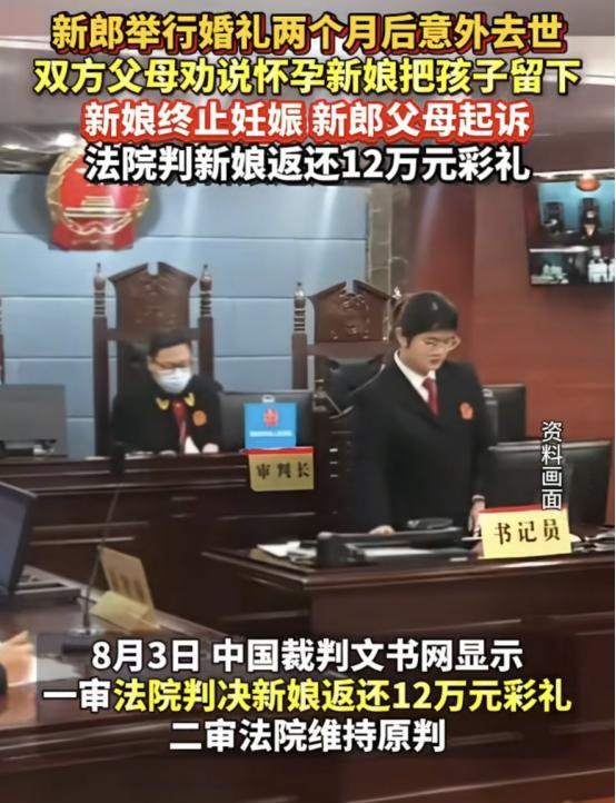 河南,一女子和男子同居,怀孕后男子给女子26.6万彩礼,又花了26290元买了三金,俩人举办了婚礼,但没领证,万万没有想到,2个月后,男子意外死亡,女子立刻把孩子打掉,男子父母悲痛欲绝,儿子没了,孙子也没了,公婆告到法院,要求女子退还彩礼15万元,案件经过一审二审,法院的判决令人意外。 “这可是我们郭家唯一的血脉啊……是我们活着的念想啊!”儿子的去世,使郭某的父母,将全部希望寄托在了未出世的孙子身上,谁料,原本承诺生下孩子的牛某,竟背着家人毅然终止妊娠。 “金玉良缘,长命百岁!”两个月前,是二人大喜的日子,他们本是同一家企业的员工,经过不断的相处,最终,相爱并步入婚姻殿堂,由于是未婚先孕,这也使得婚事仓促提上日程,那时候,看着新娘渐渐隆起的肚皮,婆婆别提多高兴了! 2024年3月,此时的新娘牛某已经怀孕3月,这时也是他们举办婚礼的日子,按照农村习俗,郭某父母一共向女方支付26.6万元彩礼,并额外花费2.6万元购买三金,谁料,百天未过,郭某的遗照已挂在堂屋! 那天夜里,郭某如往常一样上班,但在途中不幸发生意外,当心电图拉直的那一刻,全家人都悲痛万分,婆婆更是跪在牛某面前,乞求她一定要将孩子生下来,当时,牛某也眼含热泪,用力地点了点头。 然而,仅仅一个月后,牛某便违背当初的诺言,瞒着家人偷偷前往医院,将仅有4个多月的孩子打掉! “你考虑好了吗?确定不需要通知家属?”手术前,医生曾不止一次的向其询问,牛某紧攥着手术告知书,眼里的泪水止不住的往下流,在最后一次抚摸隆起的肚皮后,她颤抖着签下了字…… 在牛某看来,年幼的孩子从出生便没有父亲,这势必会对其健康生长造成极大的影响,甚至会不断的遭到周围人异样的目光、言语,加之家里没了“顶梁柱”,公婆又年纪太大,各项生活等的压力,她一人难以支撑。 然而,公婆却不以为然,他们认为牛某背信弃义,狠心剥夺了家族最后的血脉!最终,公婆以:未登记结婚加夫妻二人生活时间短为由,将牛某告上法庭,在扣除二人共同生活开支后,要求其返还彩礼15万元。 最终,法院判决:牛某返还12万元彩礼,二审维持原判! “钱回来了,但我们的儿子、孙子却永远的离开了!”这场诉讼没有所谓的赢家,26.6万元彩礼,隔开的是两代人的绝望:一对老人失去了儿子和未出世的孙子,一位新娘又何尝不是饱受身体和心灵的双重打击! 对此,不少网友表示:赞同女方的做法,单亲母亲的经济压力、再婚阻力等是其不得不考虑的现实。也有网友表示:女方一定不爱自己的丈夫,不然的话,不论生活再困难,她都会想办法克服,毕竟这是一个家庭的未来希望! 对此,您是怎么看待这件事的呢? 信息来源: 中国蓝新闻|《第11集,婚礼两个月后新郎意外去世,怀孕新娘在男方父母不知情的情况下,自行终止妊娠,法院判新娘返还12万元彩礼》 文|梅林 编辑|南风意史