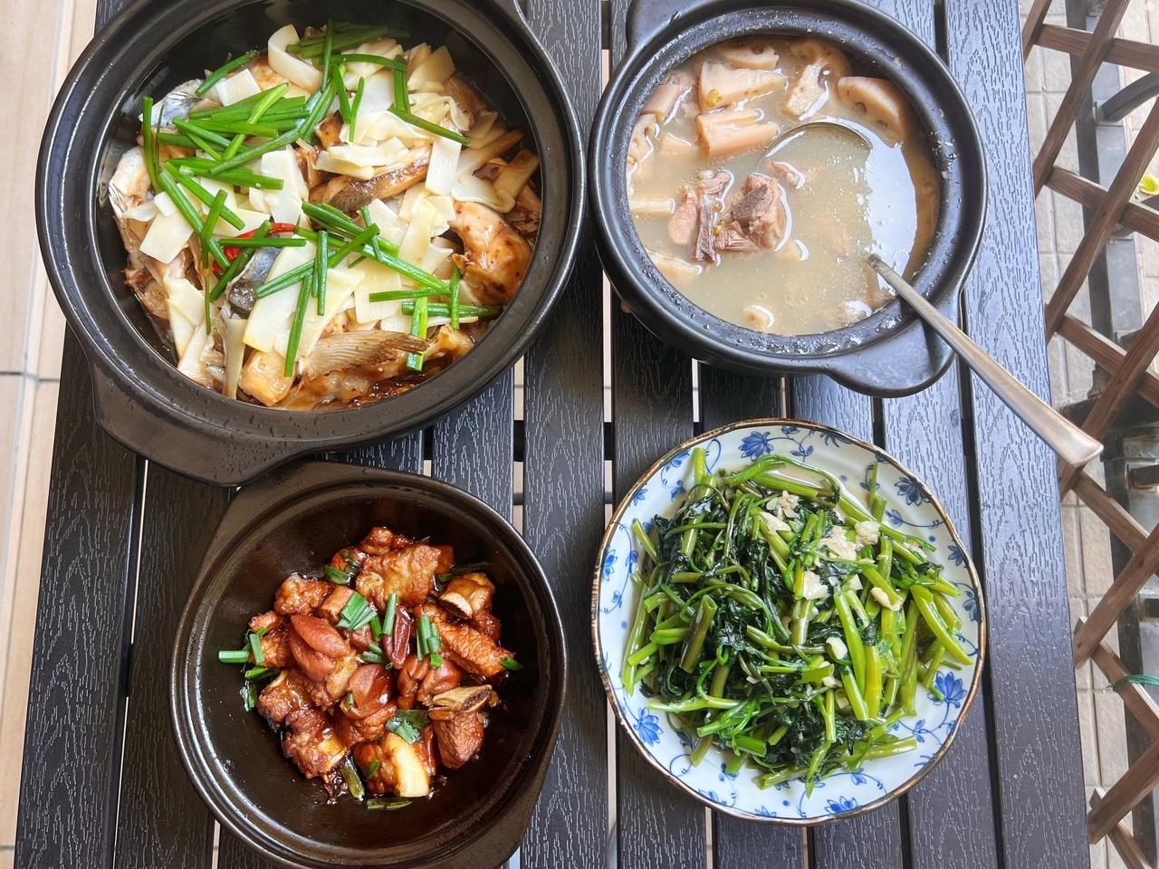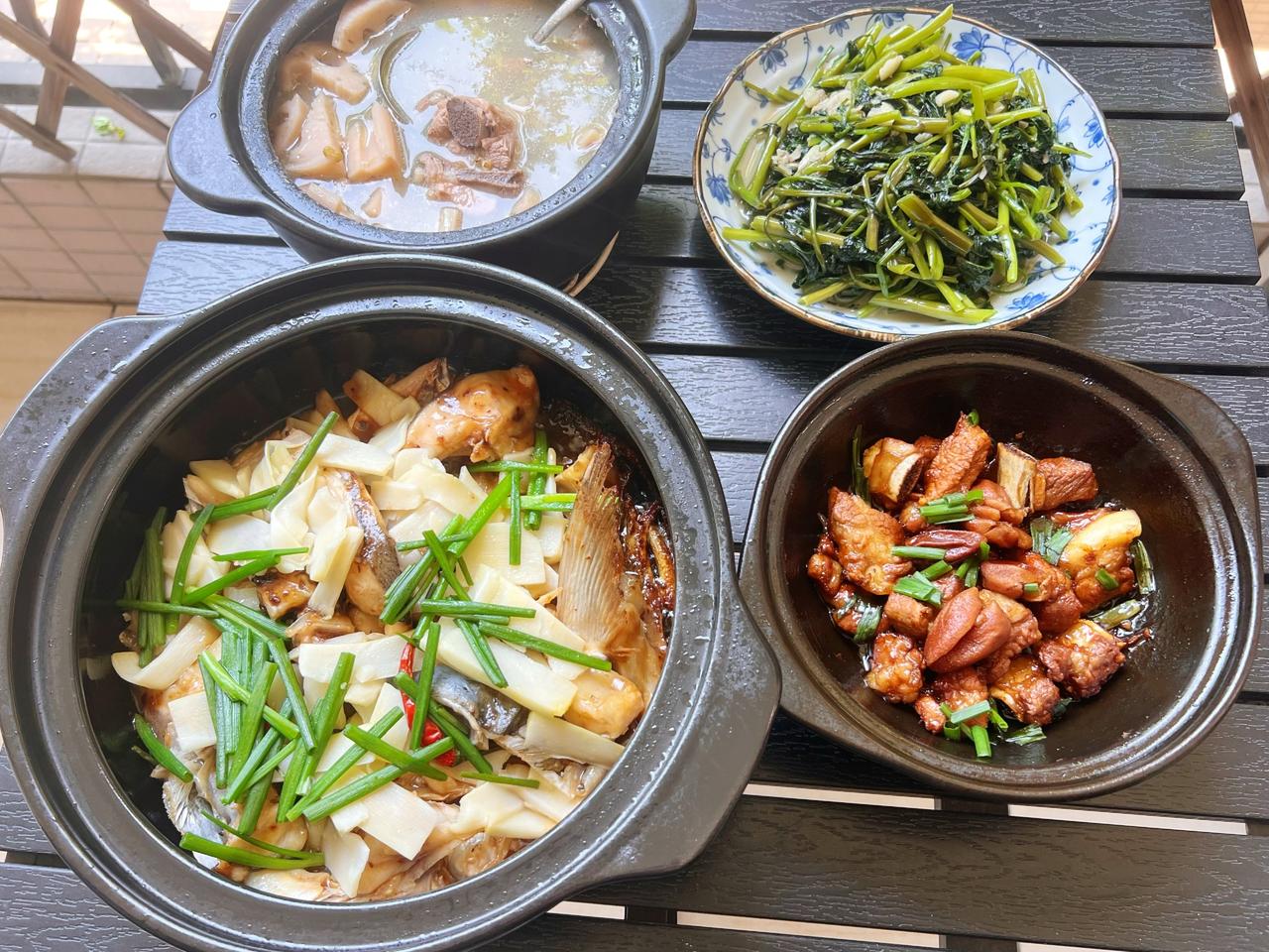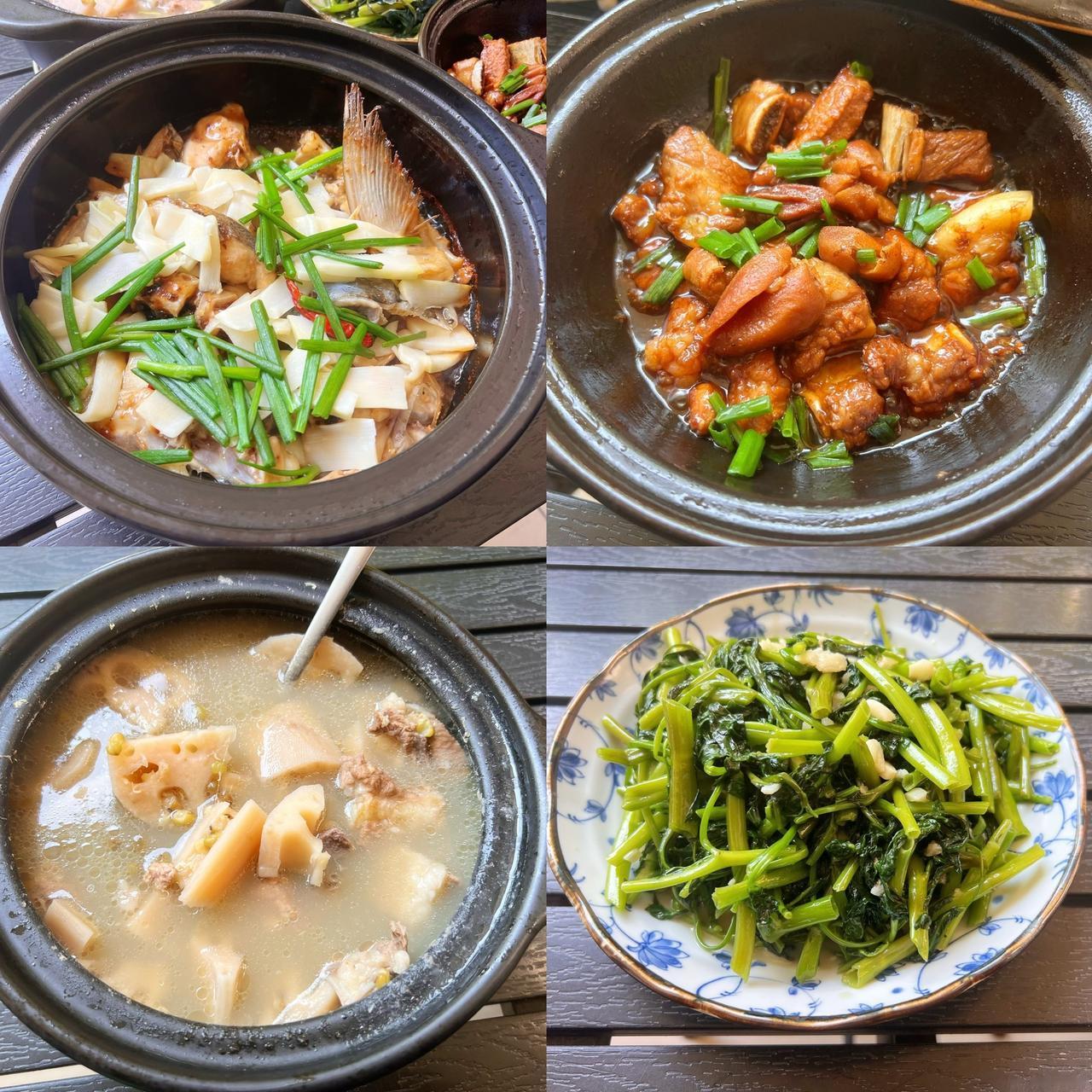 🍚两人食|夏天的三菜一汤,是我的用心呀~ 今天琢磨着给俩人做顿午餐,从食材搭配到下锅翻炒,每一步都藏着我的小心思,热乎乎端上桌的瞬间,觉得超满足~ 🐟【酸笋鱼头煲】 处理鱼头得耐心点,鱼鳃挖干净切块,用米酒+生抽+少许盐+砂糖+胡椒粉+淀粉抓匀,淋圈油锁住水分,腌15分钟以上才够味~ 砂锅爆香多量姜蒜(去腥关键!),平铺鱼头和酸笋,大火焗8分钟,沿边淋米酒增香,再焗2分钟撒葱段,借着砂锅余温焖一会儿,掀开盖那股酸香直钻鼻子,鲜得很! 🥣【莲藕绿豆排骨汤】 排骨不用焯水,用盐和淀粉搓洗几遍去油脂,炖出来的汤才清亮~ 莲藕削皮切小块,孔里的泥沙冲干净,和排骨、一把绿豆一起下锅,大火烧开转小火炖1小时,加盐调味就成~ 夏天喝这个太合适了,绿豆清热,莲藕粉糯,我俩分着喝,清爽又滋润~ 🍖【黄皮焖排骨】 排骨直接下炒锅,热油煎到两面金黄(逼出油脂不腻口),淋米酒+生抽+老抽+砂糖+少许蚝油,放几颗蜜饯黄皮增味,加清水烧开后转砂锅,小火焗20-30分钟收浓汁,撒葱粒出锅~ 黄皮的酸甜混着肉香,我俩边啃边说“够味”~ 🥬【腐乳炒通心菜】 蒜末爆香,加腐乳压碎炒出香味,大火放通心菜快炒,最后撒点盐(腐乳有咸味,别多放!),翠绿的菜叶裹着腐乳香,清爽解腻,配肉吃刚好~ 和喜欢的人分食这桌菜,筷子碰着碗的叮当声,比啥都治愈~ 家常菜