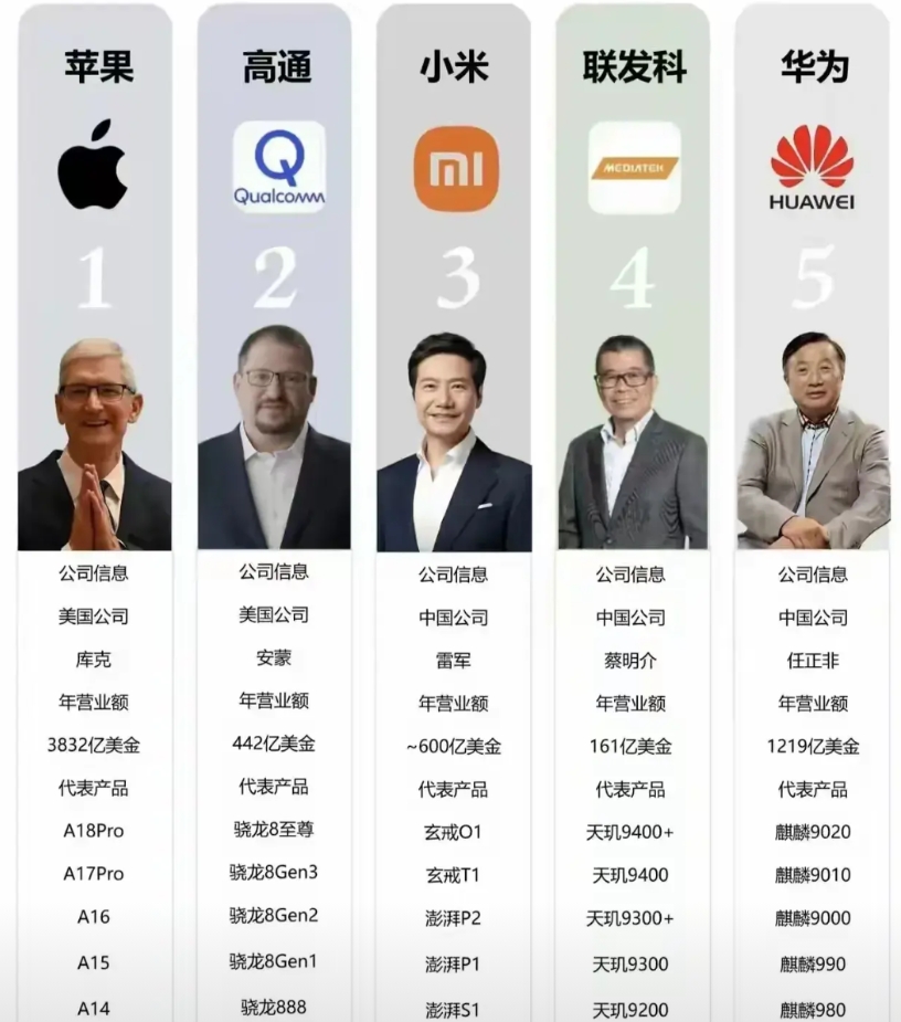 全球5大手机芯片企业,美国2个,国产占了3个,小米排第3,联发科排第4,华为第5