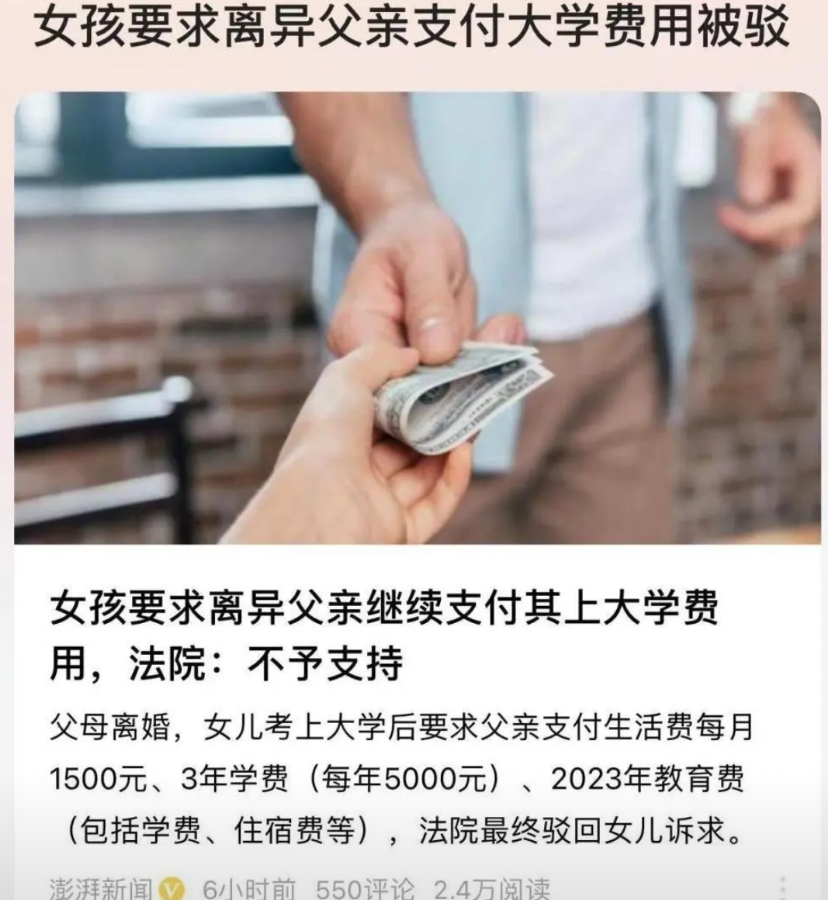 江苏邳州这事儿,看了真让人唏嘘!离婚爸爸按约定给女儿抚养费到18岁,结果女儿考上大学,直接要9000块电脑、3000块手机,还让继续给每月1500生活费,不给就告上法庭。 2017年,江苏邳州的马某和妻子分开了,两人商量好,女儿小马跟着妈妈过,马某每个月给1500块抚养费,一直给到女儿18岁。 这几年里,马某没拖欠过一次,按时把钱打到账户上,日子就这么不紧不慢地过着。 2024年,小马考上了大学,拿着录取通知书的那天,家里先是一阵高兴,可转头就被现实压得喘不过气。 妈妈一个人带着她,日子过得紧巴巴,大学里的学费,住宿费,还有日常开销,像一座小山压过来。 小马想着爸爸,觉得自己还在上学,没能力挣钱,爸爸总该帮衬一把。 她找到马某,说想让他除了继续给每月的生活费之外,还得承担她在大学几年的学费和住宿费。 除此之外,她还提了要买新的电子设备,总价差不多12000元,说这些是学习必需的。 马某听完就犯了难,他自己日子过得也不宽裕,手里没多少闲钱。 再说,当初白纸黑字写着抚养到18岁,现在女儿已经成年了,他觉得自己的义务已经尽到了。 他跟小马解释自己的难处,可小马听不进去,觉得爸爸就是不想管她,几次商量都吵得不欢而散。 最后,小马一纸诉状把马某告到了法院,希望法官能让爸爸按她说的数额掏钱。 法庭上,马某显得有些无奈,他说自己不是不愿意帮女儿,是真的没那个能力,女儿已经长大了,该学着自己想办法了。 法院里的人仔细看了案子,他们说,法律里确实写着父母有抚养孩子的义务,但这种义务主要针对未成年的孩子,或者那些因为身体有残疾,没办法自己挣钱生活的成年子女。 小马已经是成年人了,上的是大学身体也好好的,能自己想办法维持生活,所以按照规定,马某不用再继续支付这些费用。 最后,法院的决定是不支持马某支付小马的学费和购买物品的费用。 这件事在法院公布出来后,引起了很多人的讨论。 有人觉得小马有点过分,说她要是真缺钱,买个几千块的电脑和手机也能凑合用,非要买那么贵的,不像是真心求学,倒像是把爸爸当成了摇钱树。 还有人说,18岁已经是成年人了,大学里有助学贷款,课余时间也能去兼职,总能想出办法,不能总靠着父母。 也有人替小马觉得委屈,说一个女孩子刚上大学,确实没什么挣钱的本事,妈妈又能力有限,当爸爸的就算没法律义务,从感情上也该帮衬一把。 要是在完整的家庭里,孩子考上大学,父母高兴还来不及,肯定主动掏钱支持,哪会闹到法庭上。 马某心里也不是滋味,他看着女儿把自己告上法庭,心里又酸又涩。 他知道女儿上学不容易,可自己的难处也没人懂。 当初离婚后,他虽然没跟女儿住在一起,但每月的抚养费从没落下,现在女儿这么做,让他觉得这些年的付出好像都白费了。 小马从法院出来的时候,脸色不太好看。 她可能没想通,为什么爸爸就不能再帮自己几年,为什么法院也不站在自己这边。 她或许真的觉得委屈,觉得爸爸不够爱她,可她没想想,爸爸是不是真的有能力满足她的要求,也没想想自己已经成年,该学着为自己的生活负责了。 其实,这样的事儿在现在也不算少见。 孩子长大后,尤其是上了大学,花钱的地方多了,一方经济跟不上,就容易寄希望于另一方。 只是,这里面牵扯着太多东西,有当初的约定,有各自的经济状况,还有剪不断的亲情。 马某后来也没多说什么,只是偶尔会打听一下女儿在学校的情况。 有人劝他,就算没法律义务,要是以后手头宽裕了,还是给女儿点帮助,毕竟是亲生的。 他听了,只是叹了口气,没说行,也没说不行。 小马在学校里怎么样了,没人太清楚。 听说她申请了助学贷款,课余时间也去做了兼职,虽然累点,但好歹能维持学业。 只是不知道,她和爸爸之间的那层隔阂,什么时候才能解开。 生活就是这样,总有各种各样的难处,尤其是在破碎的家庭里,亲情和现实往往会拧成一团,让人说不清道不明。