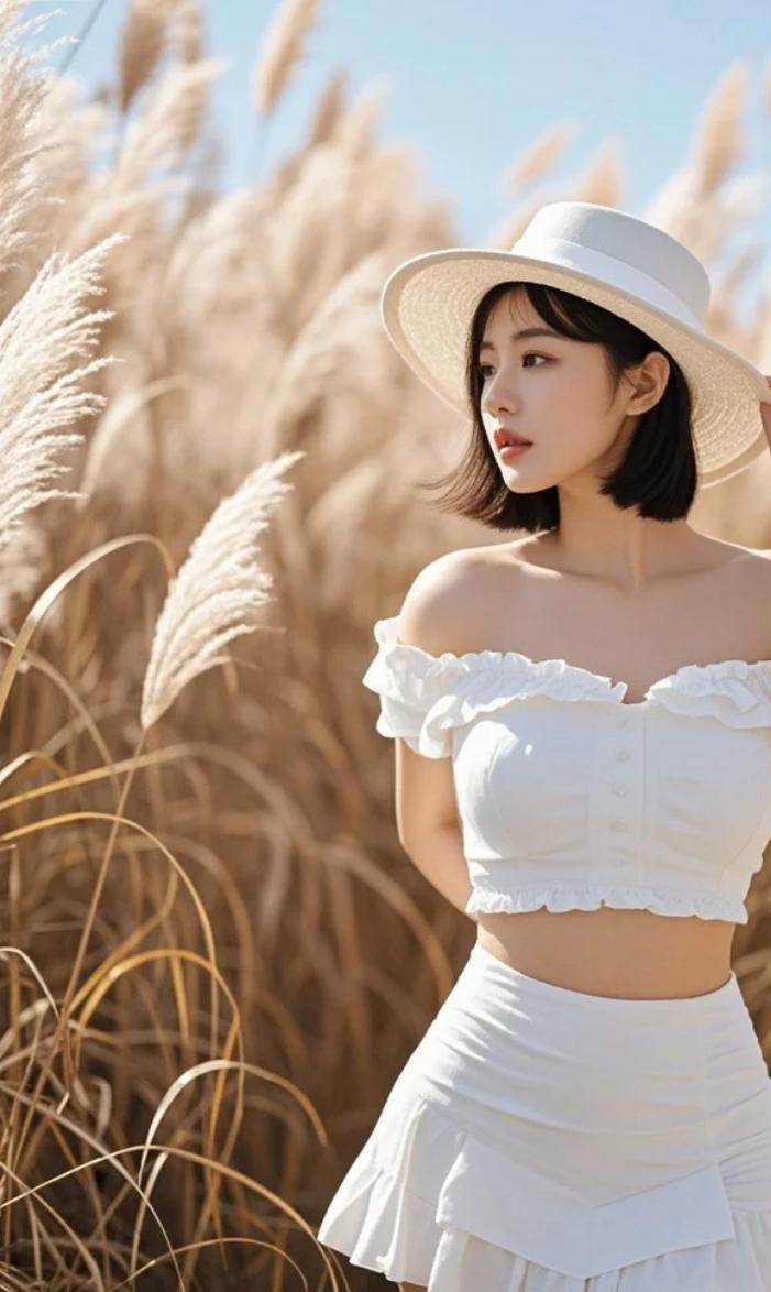她穿的这身衣服,和芦苇海搭吗?1分(不搭)到10分(绝配),打分!