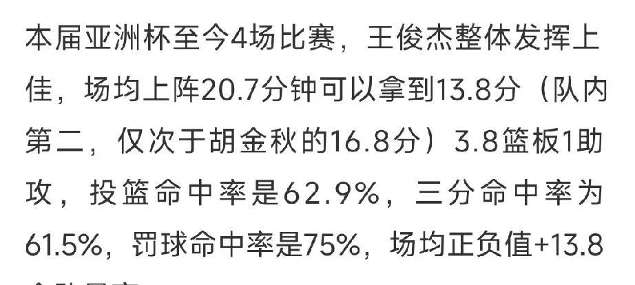 王俊杰这亚洲杯场均正负值全队最高! 亚洲杯开赛下以来,王俊杰的表现一直是大家关注的重点,王俊杰也用一场场的表现征服了所有球迷。 王俊杰亚洲杯目前出战四场比赛,场均能贡献13.8分,仅次于胡金秋的16.8分,队内正负值13.8,为全队最高!这个正负值太能说明问题了!也就意味着王俊杰上场,场均赢了对手13.8分,这是对运动员在场效率的最好体现! 今日将迎战新西兰,都知道凶多吉少,但是中国男篮要打出自己的风格,防住对方,取胜还是有机会的!