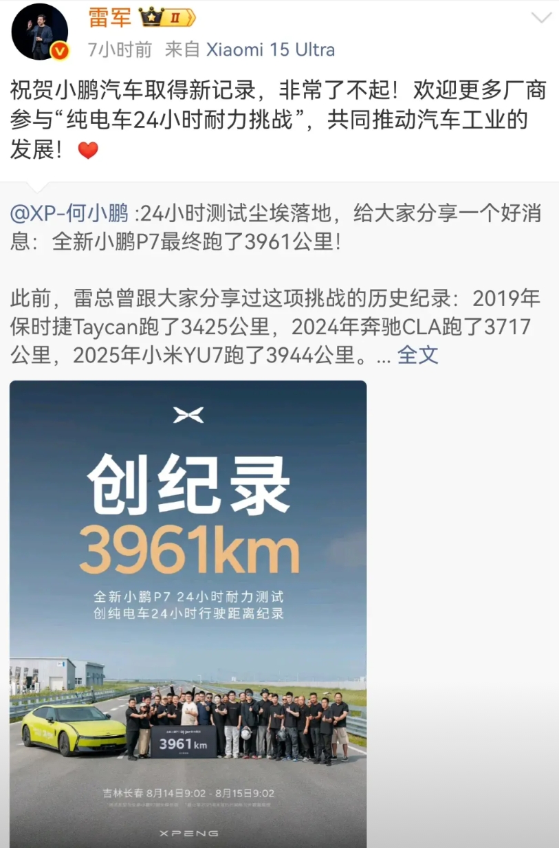 雷军在微博向小鹏表示了祝贺!何小鹏,也在分享记录的时候,特意点了一下雷军语录,强调了一下雷军的理念,回顾了大哥小米的记录,并且礼貌的提了一下只比大哥多了10多公里,这就是人情世故,正所谓有人的地方就有江湖!