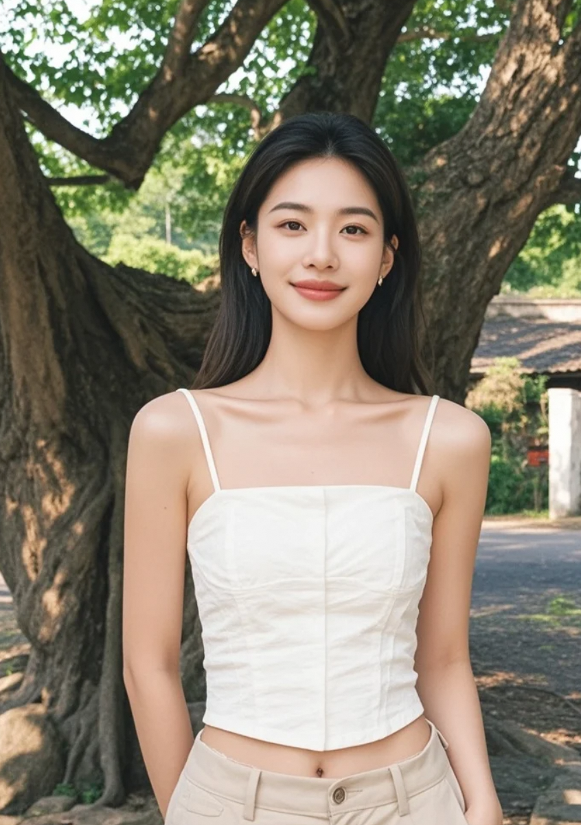 老榕树下,她倚树而立,仿佛守着整个村庄的旧时光。