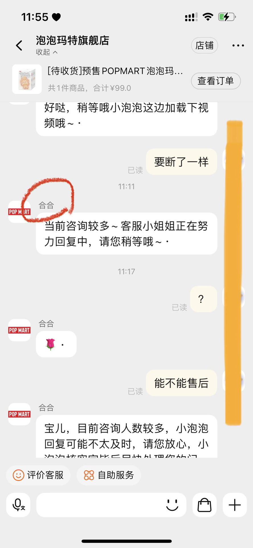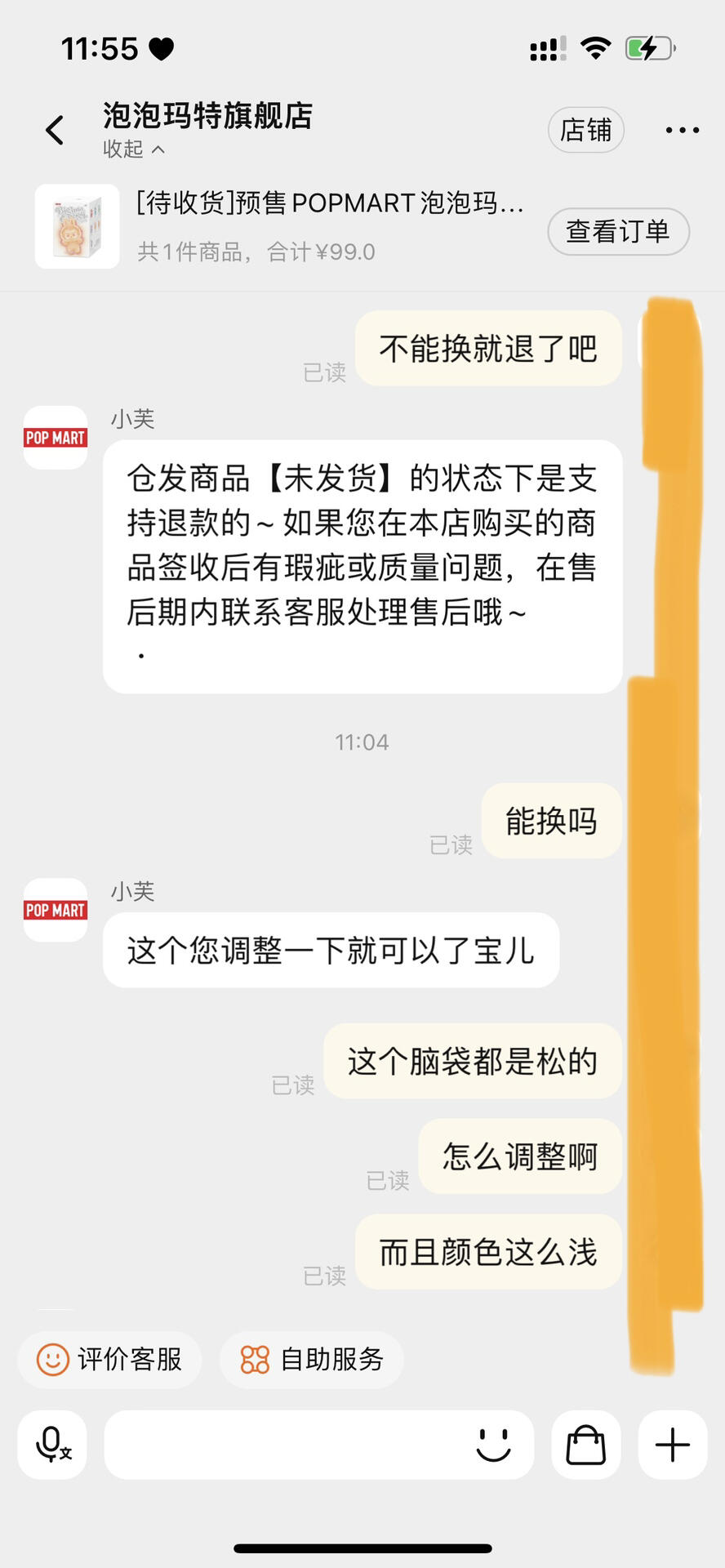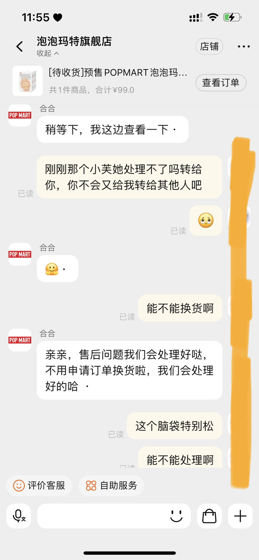 之前抢的labubu售后回来质量还是不好 就去找了客服 一开始接待的是小芙 按要求发了照片和视频也说明了诉求想换货 发了两个视频后来小芙说她查看一下就给我转给了合合,结果这个合合比机器人还机器人,话术一直在复制粘贴,问能不能售后能不能处理一直发表情包敷眼,拖时间,就是不正面回复问题,问了快一个小时能不能给我处理,就是不答复,真的很生气! 后来投诉她,找了平台处理支持我退货退款,她才回复说给我换货(图9),本来一开始我就只是想换货而已,现在真的很生气,已经不想要了!