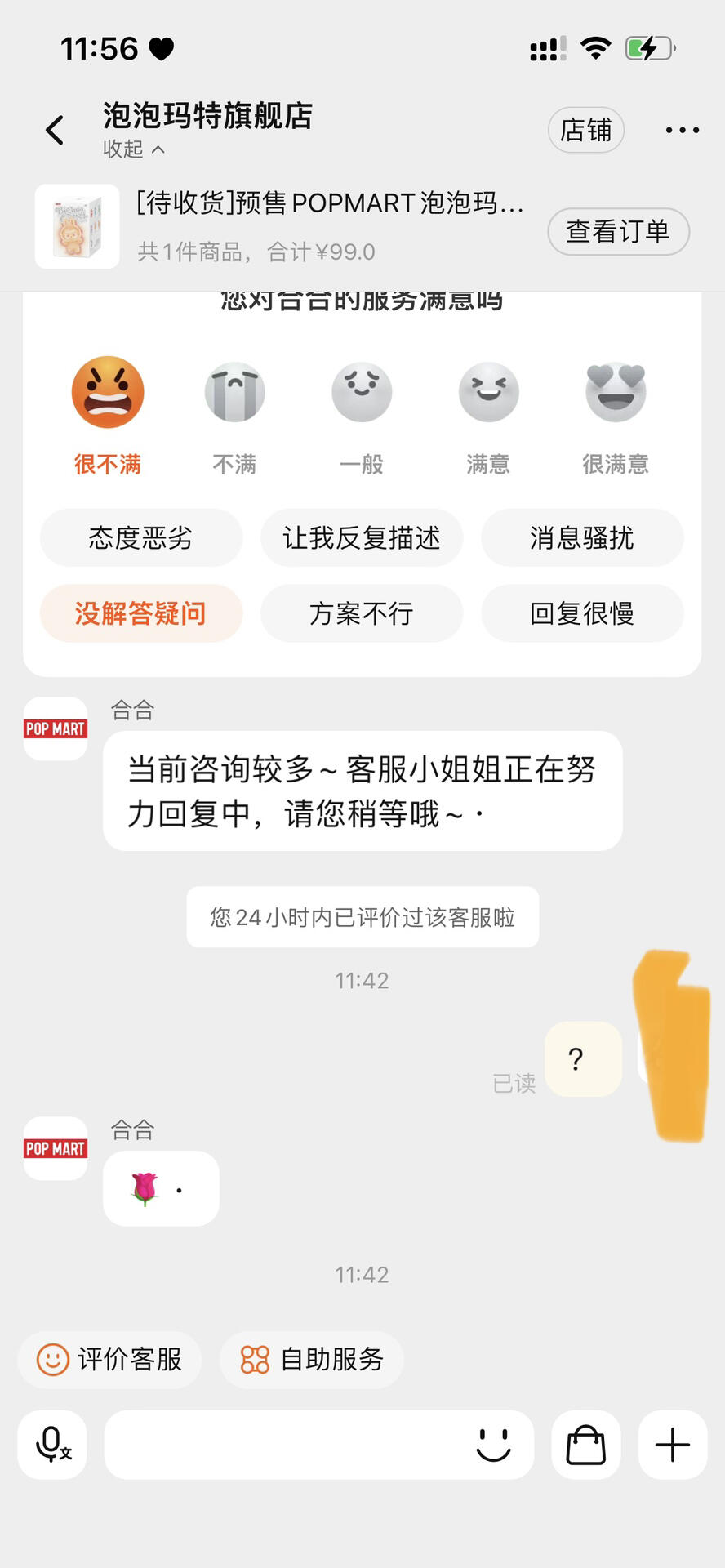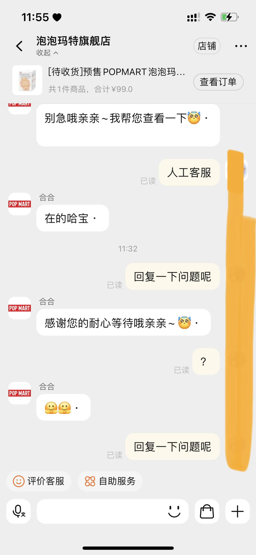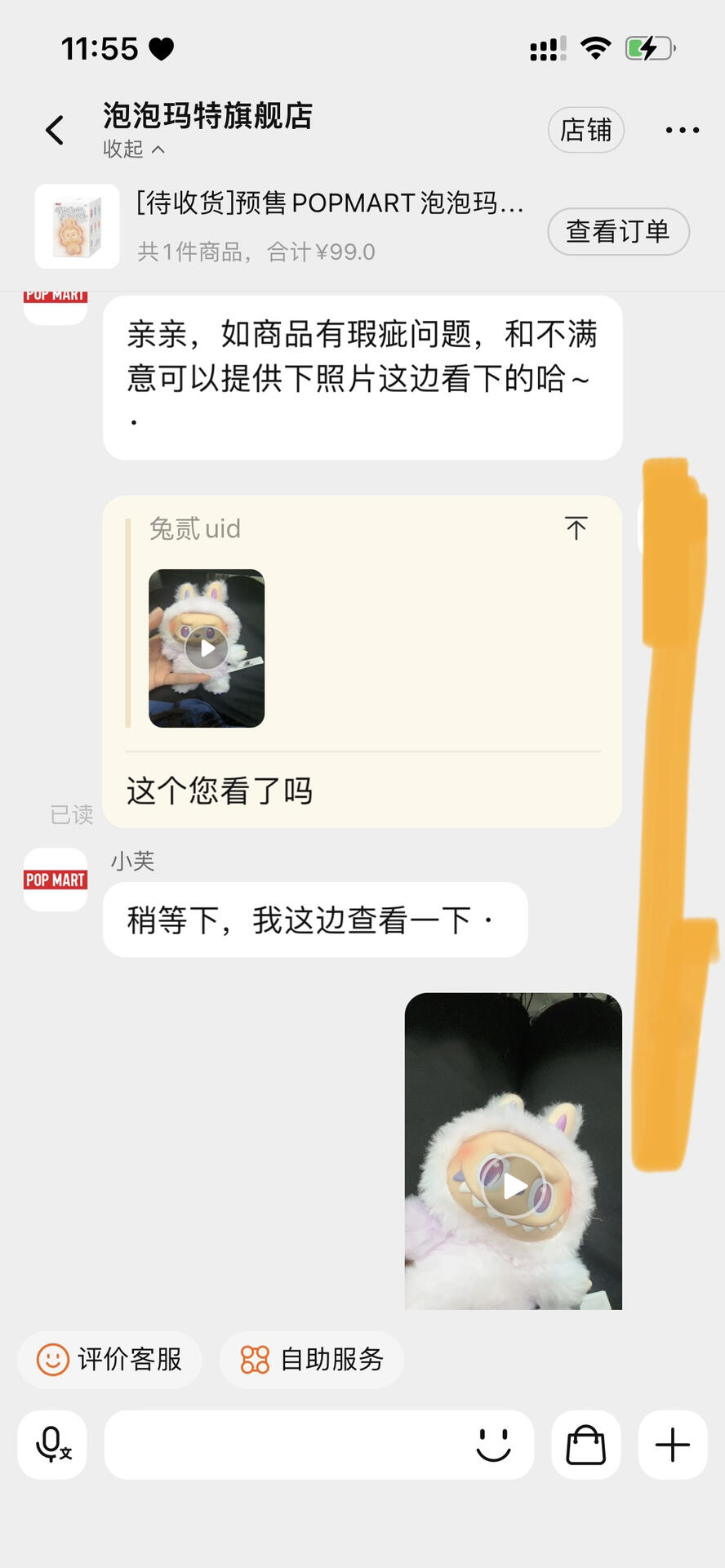之前抢的labubu售后回来质量还是不好 就去找了客服 一开始接待的是小芙 按要求发了照片和视频也说明了诉求想换货 发了两个视频后来小芙说她查看一下就给我转给了合合,结果这个合合比机器人还机器人,话术一直在复制粘贴,问能不能售后能不能处理一直发表情包敷眼,拖时间,就是不正面回复问题,问了快一个小时能不能给我处理,就是不答复,真的很生气! 后来投诉她,找了平台处理支持我退货退款,她才回复说给我换货(图9),本来一开始我就只是想换货而已,现在真的很生气,已经不想要了!