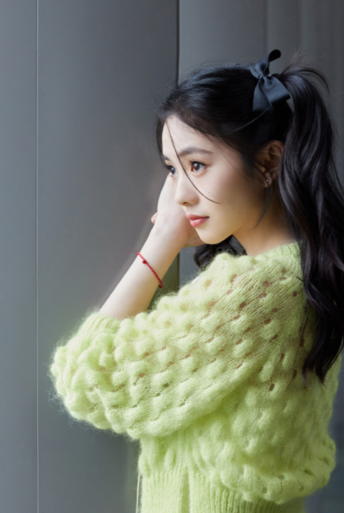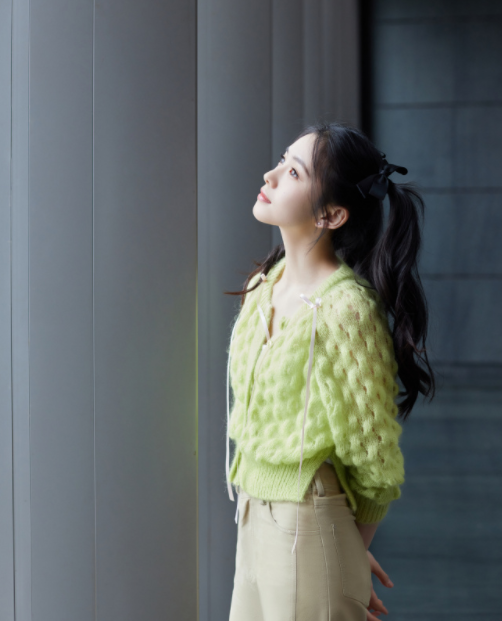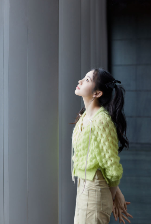 刘浩存的双马尾,搭配草绿色毛衣,真的很不错!