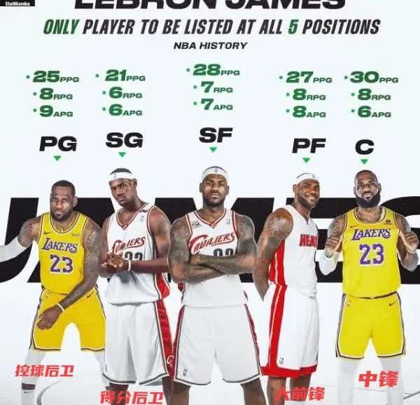 恐怖如斯!詹姆斯担任五个位置的场均数据堪称爆炸。 控球后卫——场均25分8篮板9助攻; 得分后卫——场均21分6篮板6助攻; 小前锋——场均28分7篮板7助攻; 大前锋——场均27分8篮板8助攻; 中锋——场均30分8篮板6助攻。 全能六边形战士,哪里需要顶哪里,而且顶也能顶得非常漂亮。不敢想象五个詹姆斯同时在场,五个位置都是闪光点。