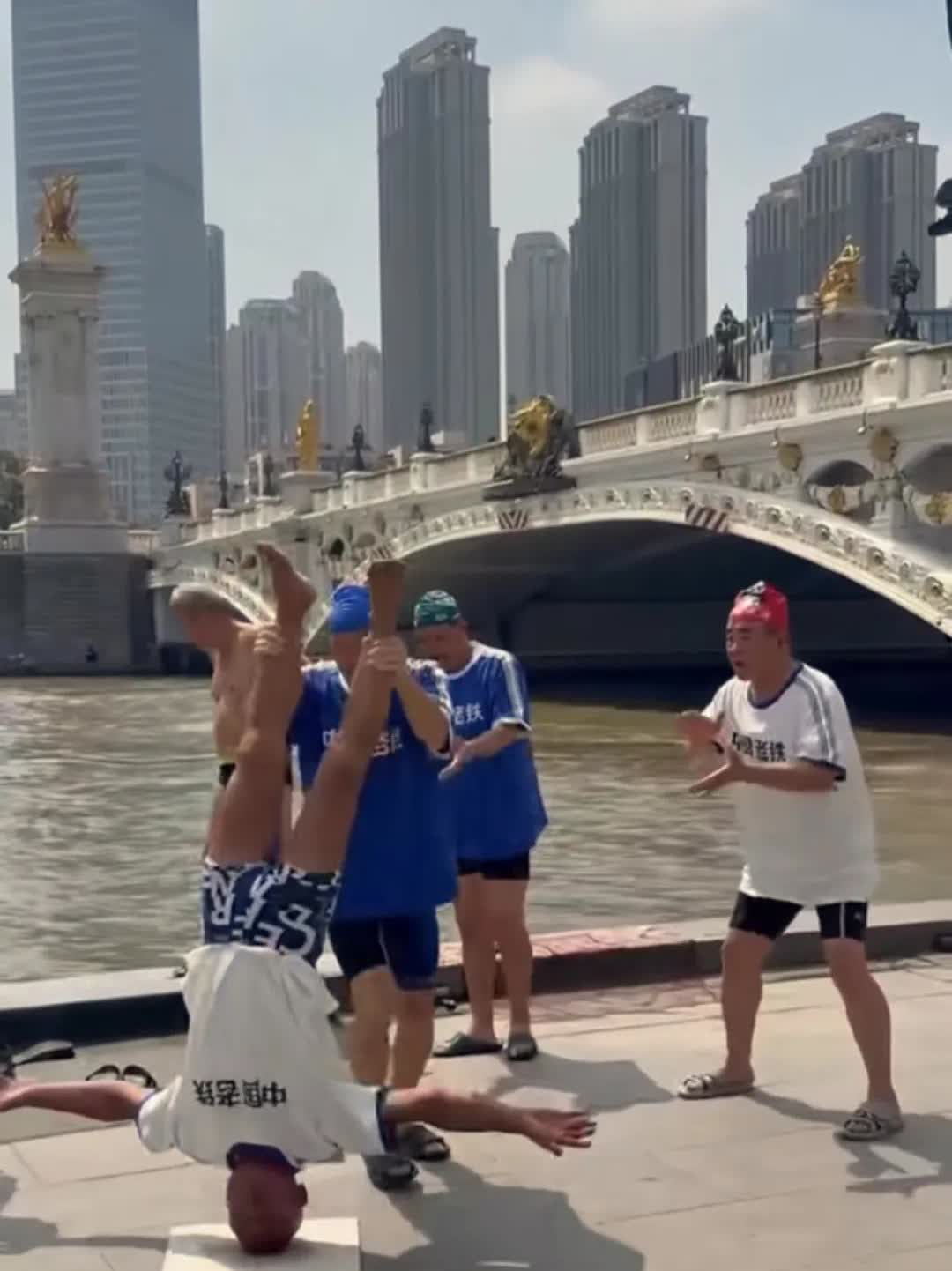 战斗机跳水大爷换新衣服了 之前在狮子林桥 现在整了统一服装,好几个大爷,这是转战另一个平台了啊 北安桥这边一直不让这个大爷在这,现在也不说话了那些个大爷 估计又要被别的大爷们批斗了,这次还整来这么多清一色的大爷助阵,哈哈哈