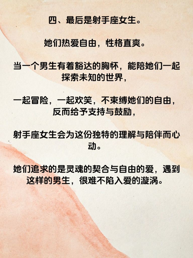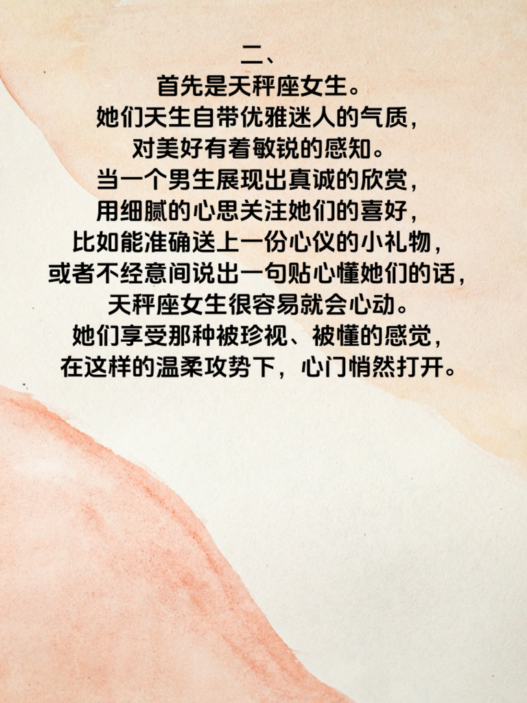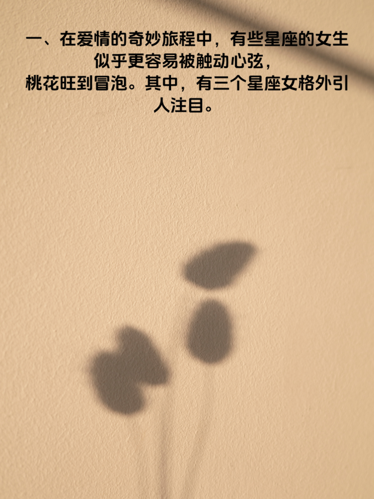 一、在爱情的奇妙旅程中,有些星座的女生似乎更容易被触动心弦,桃花旺到冒泡。其中,有三个星座女格外引人注目。 二、首先是天秤座女生。她们天生自带优雅迷人的气质,对美好有着敏锐的感知。当一个男生展现出真诚的欣赏,用细腻的心思关注她们的喜好,比如能准确送上一份心仪的小礼物,或者不经意间说出一句贴心懂她们的话,天秤座女生很容易就会心动。她们享受那种被珍视、被懂的感觉,在这样的温柔攻势下,心门悄然打开。 三、接着是双鱼座女生。她们内心充满浪漫幻想,情感细腻如丝。一个能陪她们一起漫步在星空下,倾听她们的奇思妙想,与她们共赏一场浪漫电影,或者在她们失落时给予温暖怀抱的男生,会迅速走进她们的内心。双鱼座女生渴望纯粹而真挚的爱情,只要你能营造出梦幻般的氛围,就能轻易捕获她们的芳心。 四、最后是射手座女生。她们热爱自由,性格直爽。当一个男生有着豁达的胸怀,能陪她们一起探索未知的世界,一起冒险,一起欢笑,不束缚她们的自由,反而给予支持与鼓励,射手座女生会为这份独特的理解与陪伴而心动。她们追求的是灵魂的契合与自由的爱,遇到这样的男生,很难不陷入爱的漩涡。