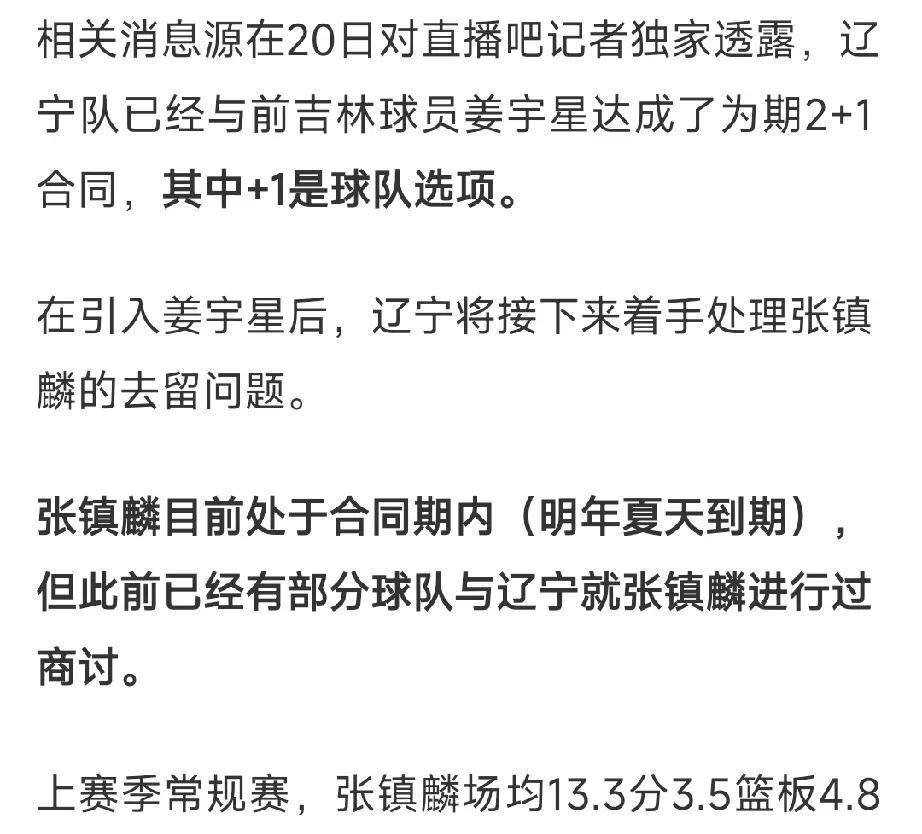 张镇麟问题将被处理!引进姜宇星后补强了3号位! 随着姜宇星加盟辽宁男篮,也算是补强了3号位,上赛季张张镇麟受伤病困扰3号位一直是鄢手琪或者俞泽辰顶替,效果不是很好,姜宇星的到来很好的弥补了3号位的能力。 张镇麟在辽宁男篮也是3号位,有消息称,辽宁队将处理张镇麟去留问题!但辽宁男篮的操作来看,张镇麟还阵不一定留辽宁,要不然也不能去引进姜宇星,也就是说辽宁男篮已经做好了张镇麟离开的打算! 但是,还是要看张镇麟个人意愿,强扭的瓜不甜,辽宁男篮肯定是要极力挽留的,但是如果其他俱乐部给出的诱惑力足够大,张镇麟的去留真的是不确定!