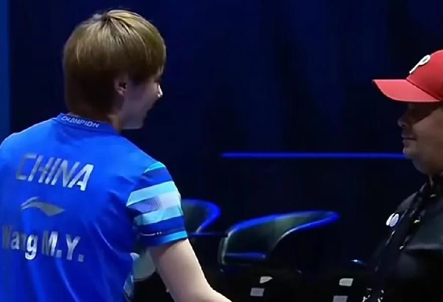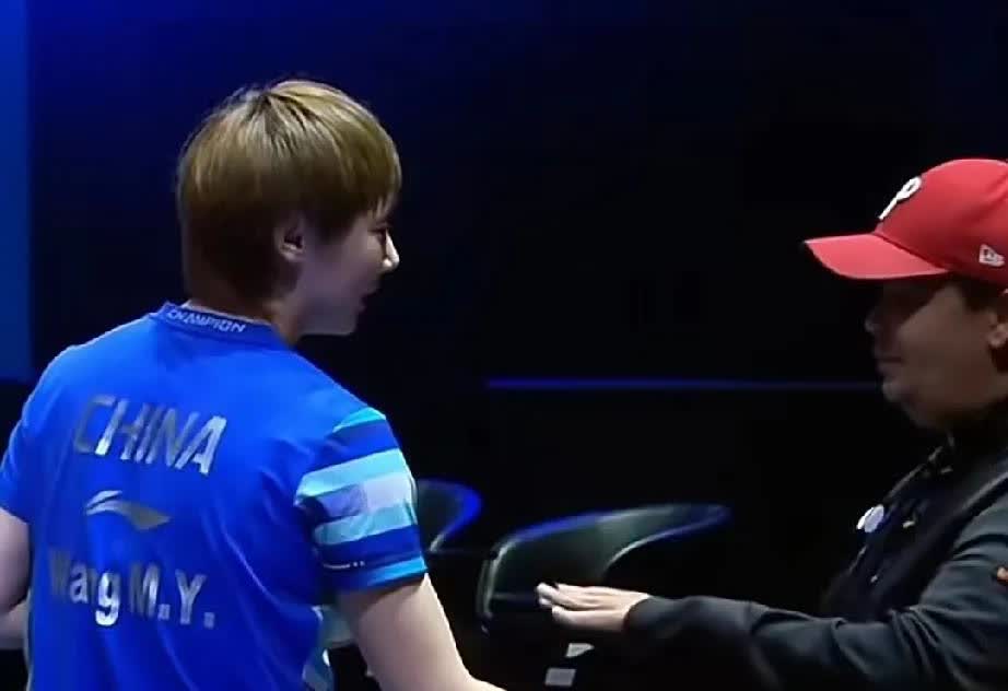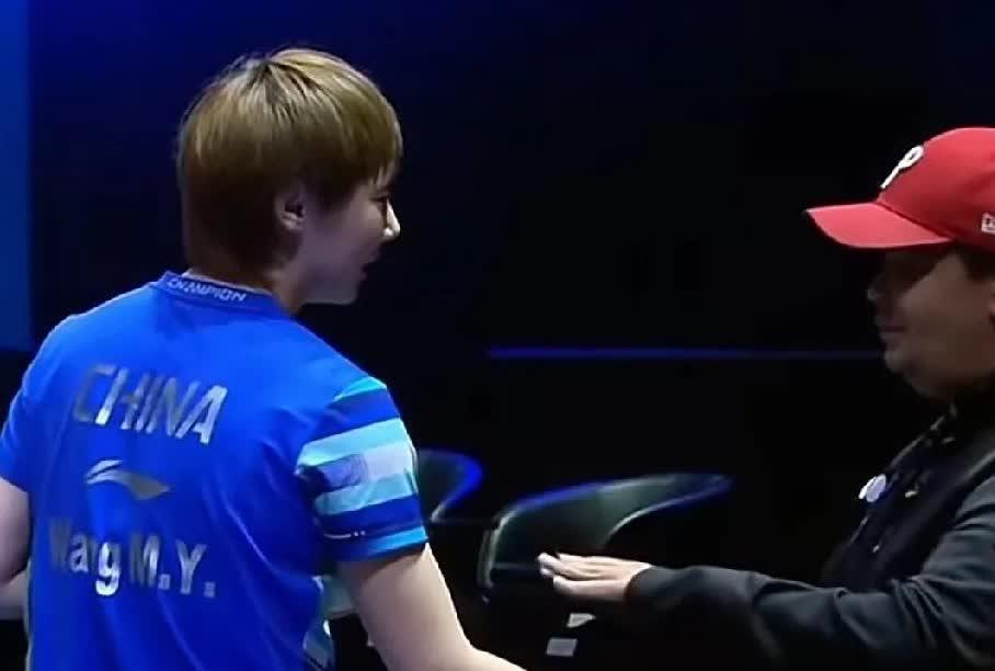 这父女俩可真有意思,被王曼昱3比0打败了以后,都紧紧握住王曼昱的手不放松。
