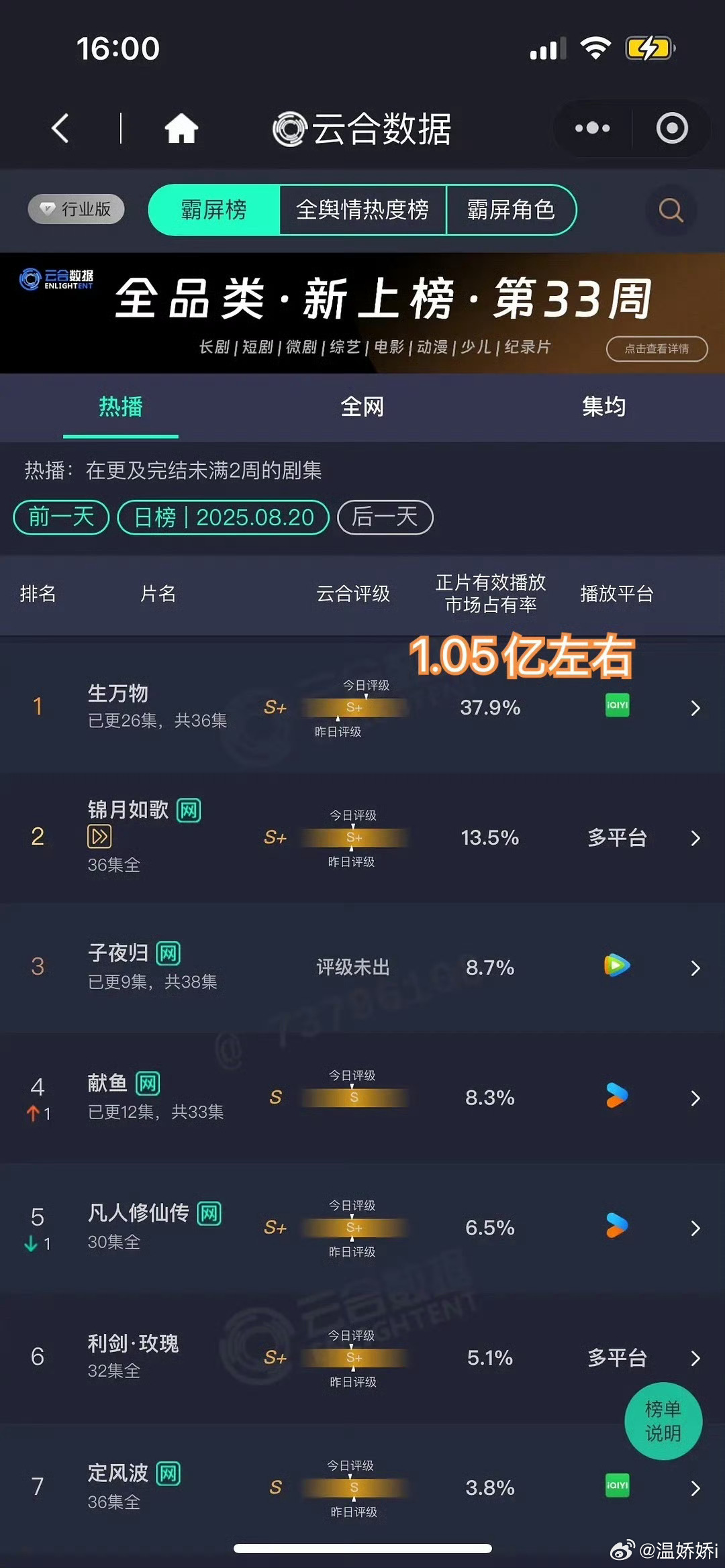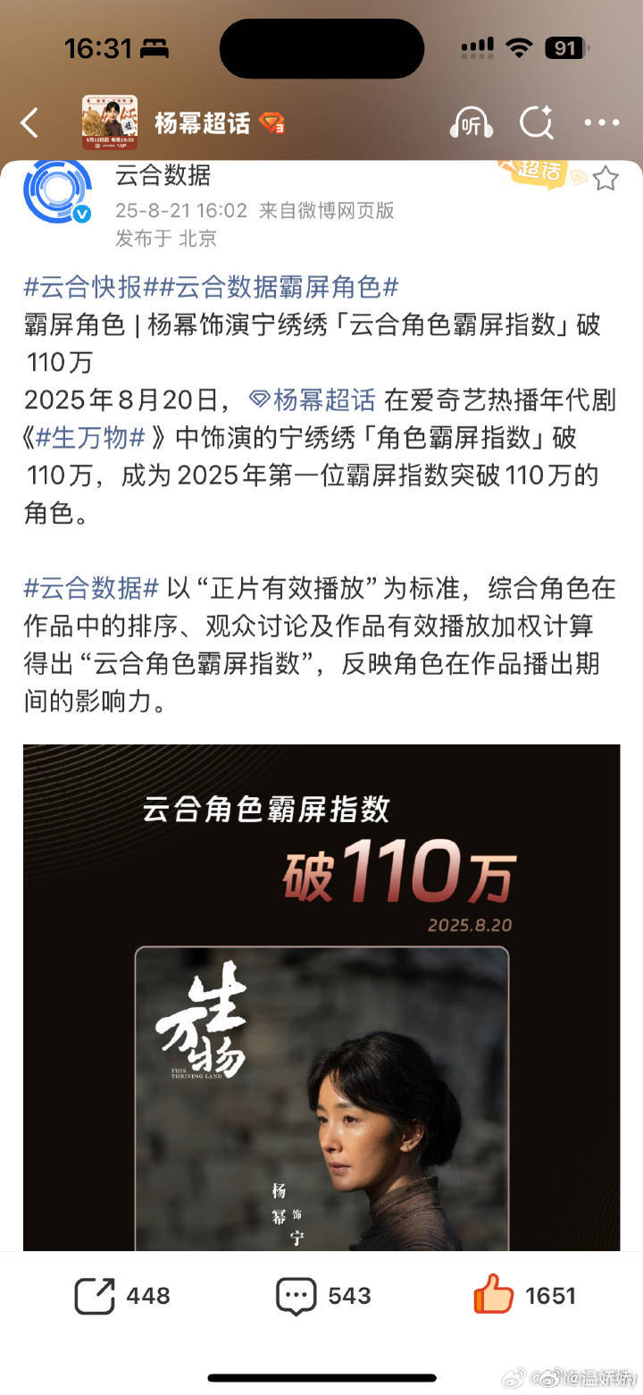 官方认证杨幂生万物云合单日有效播放量破亿 ,是2025年首部单日有效播放破亿剧集!!