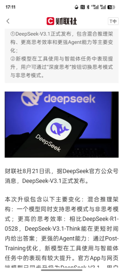 告别英伟达芯片,中美人工智能技术路线彻底走向分裂。DeepSeek-V3.1正