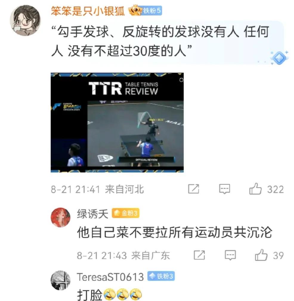 乒乓球哲学大师张本智和人设也翻车了呀! 他曾说勾手发球,反旋转发球肯定都会超过三十度的 不会真被户上和大登的世锦赛男双冠军刺激到了吧!